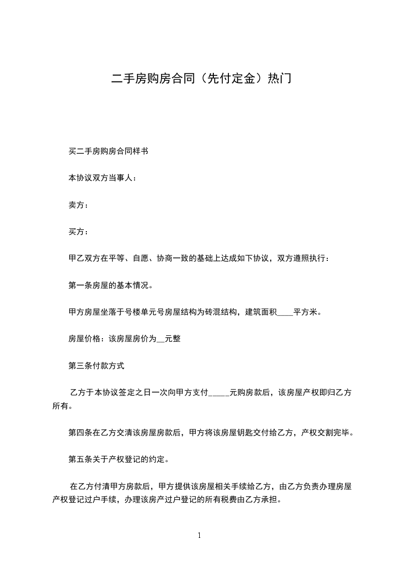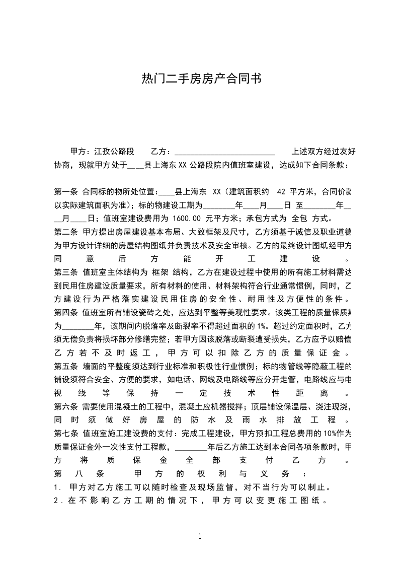 第一条:乙方购买的房屋位于__市__区,(以下简称该房屋)。甲方已取得该房屋的房屋所有权证(编号:),该房屋建筑面积为:__平方米,产权人:.