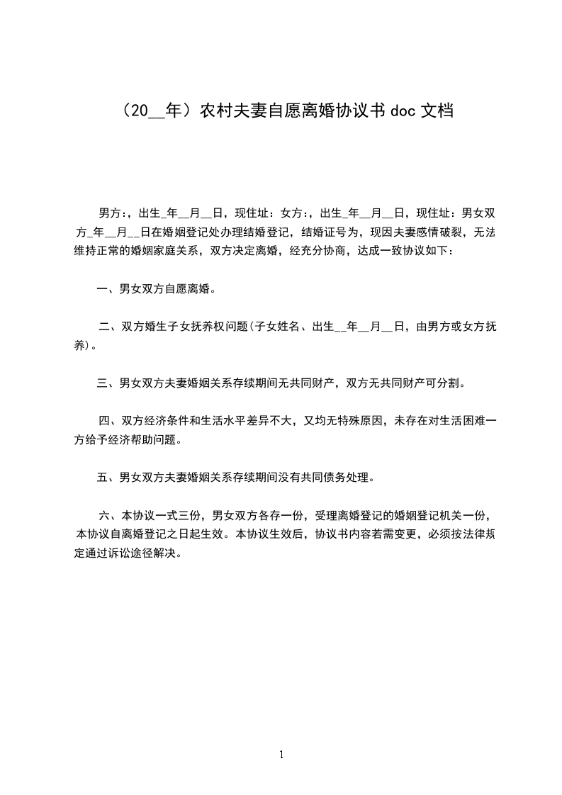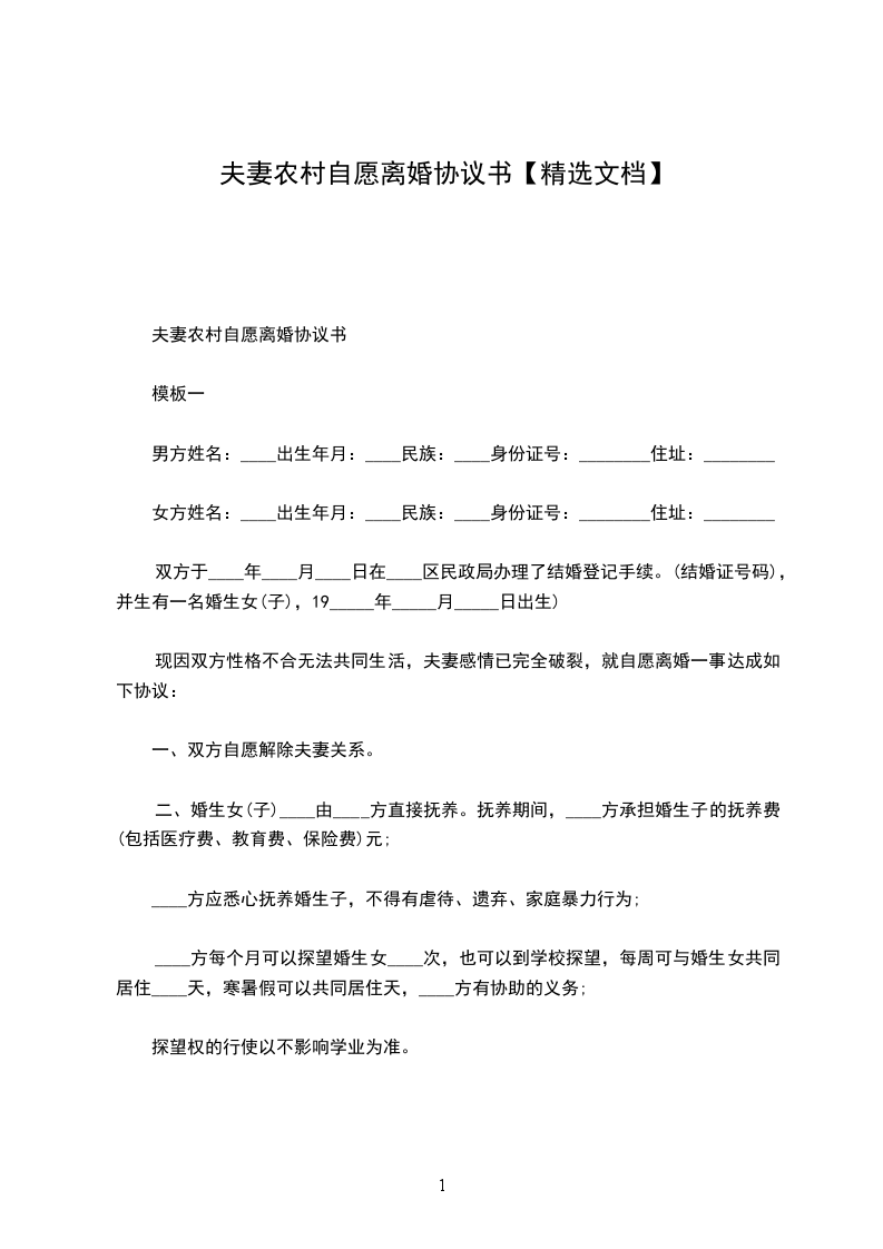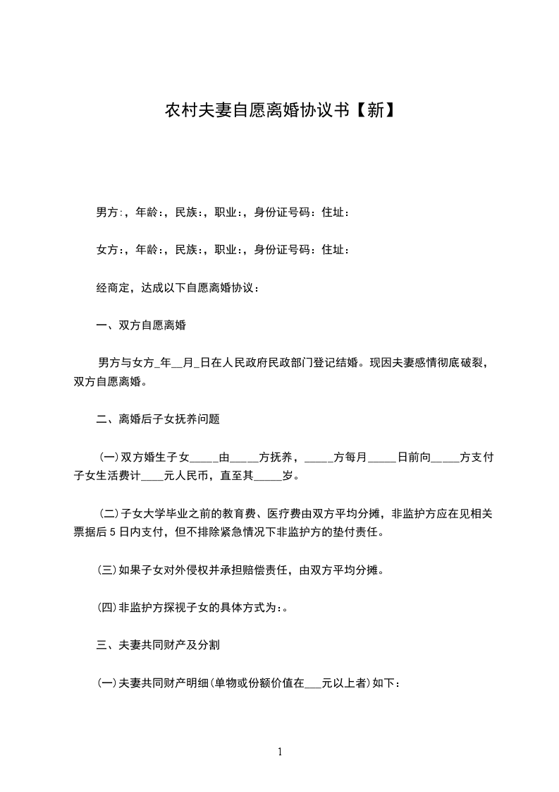 农村夫妻自愿离婚协议书【新】