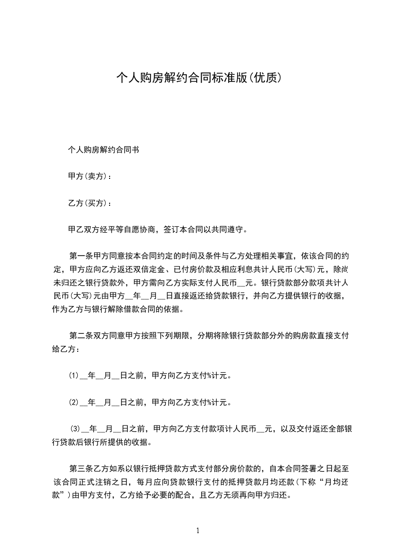 第一条甲方同意按本合同约定的时间及条件与乙方处理相关事宜,依该合同的约定,甲方应向乙方返还双倍定金、已付房价款及相应利息共计人民币(大写)元,除尚未归还之银行贷款外,甲方需向乙方实际支付人民币__元。银行贷款部分款项共计人民币(大写)元由甲方__年__月__日直接返还给贷款银行,并向乙方提供银行的收据,作为乙方与银行解除借款合同的依据。