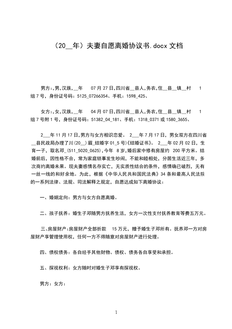 男方:______(写明姓名、性别、年龄、民族、籍贯、职业或者工作单位和职务、住址、联系电话)