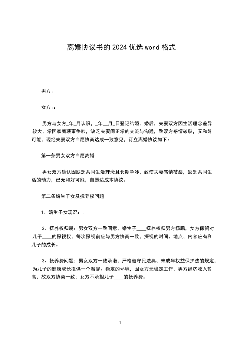 男方与女方_年_月认识,_年__月_日登记结婚。婚后,夫妻双方因生活理念差异较大,常因家庭琐事争吵,缺乏夫妻间正常的交流与沟通,致双方感情破裂,无和好可能,现经夫妻双方自愿协商达成一致意见,订立离婚协议如下: