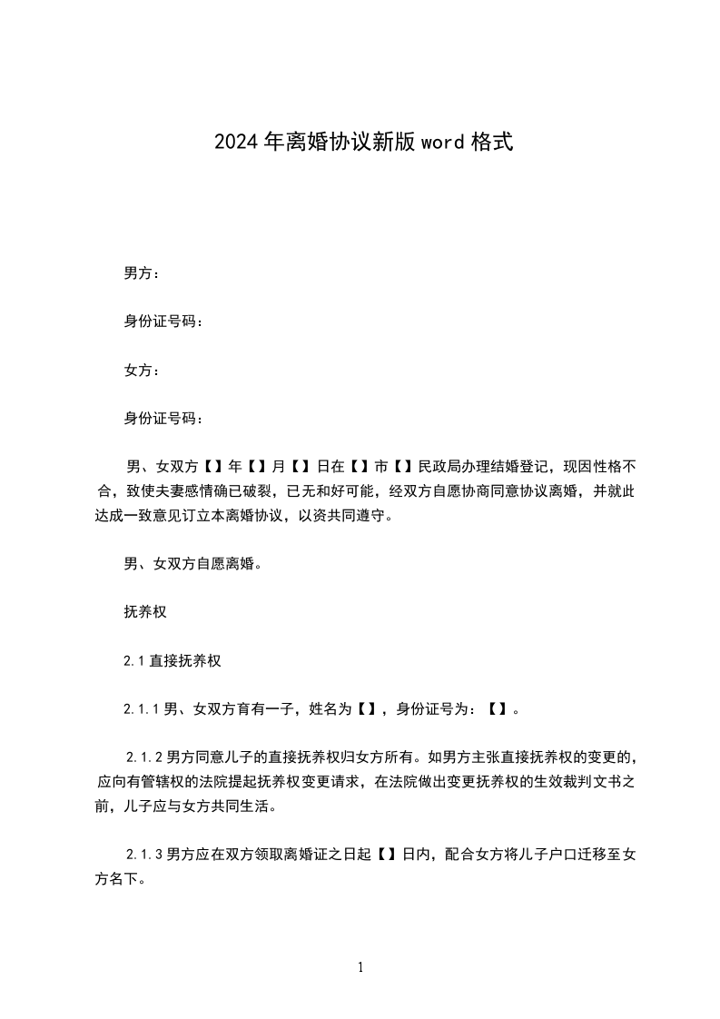 2、抚养权归属:男女双方一致同意,婚生子____抚养权归男方杨鹏,女方保留对儿子____的探视权,每次探视前应与男方协商一致,探视的时间、地点、内容应有利儿子的成长。