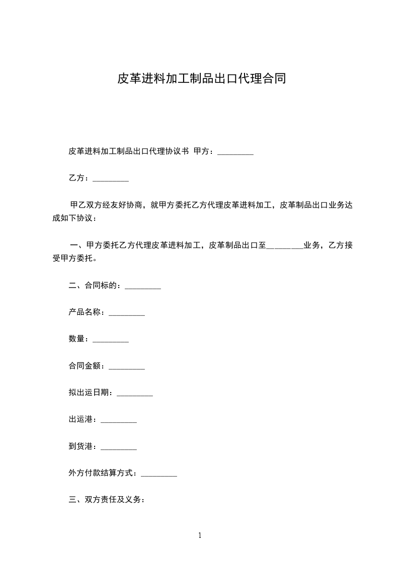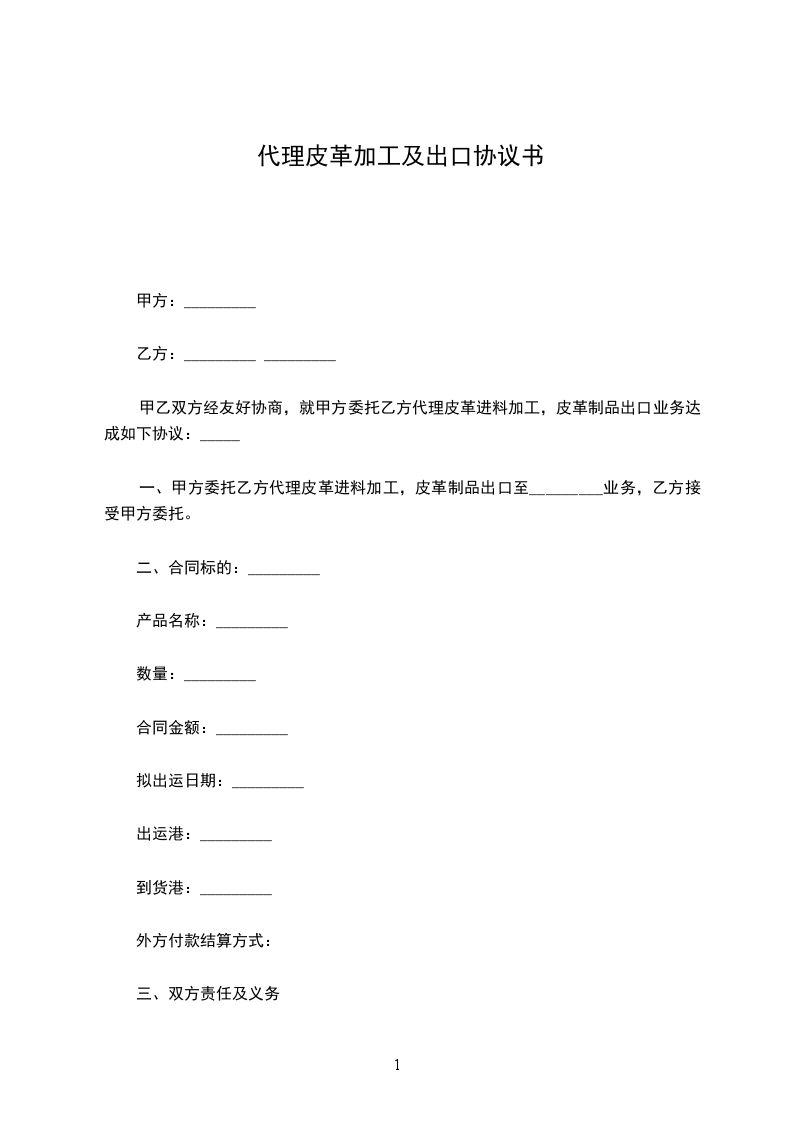 一、甲方委托乙方代理皮革进料加工,皮革制品出口至_________业务,乙方接受甲方委托。