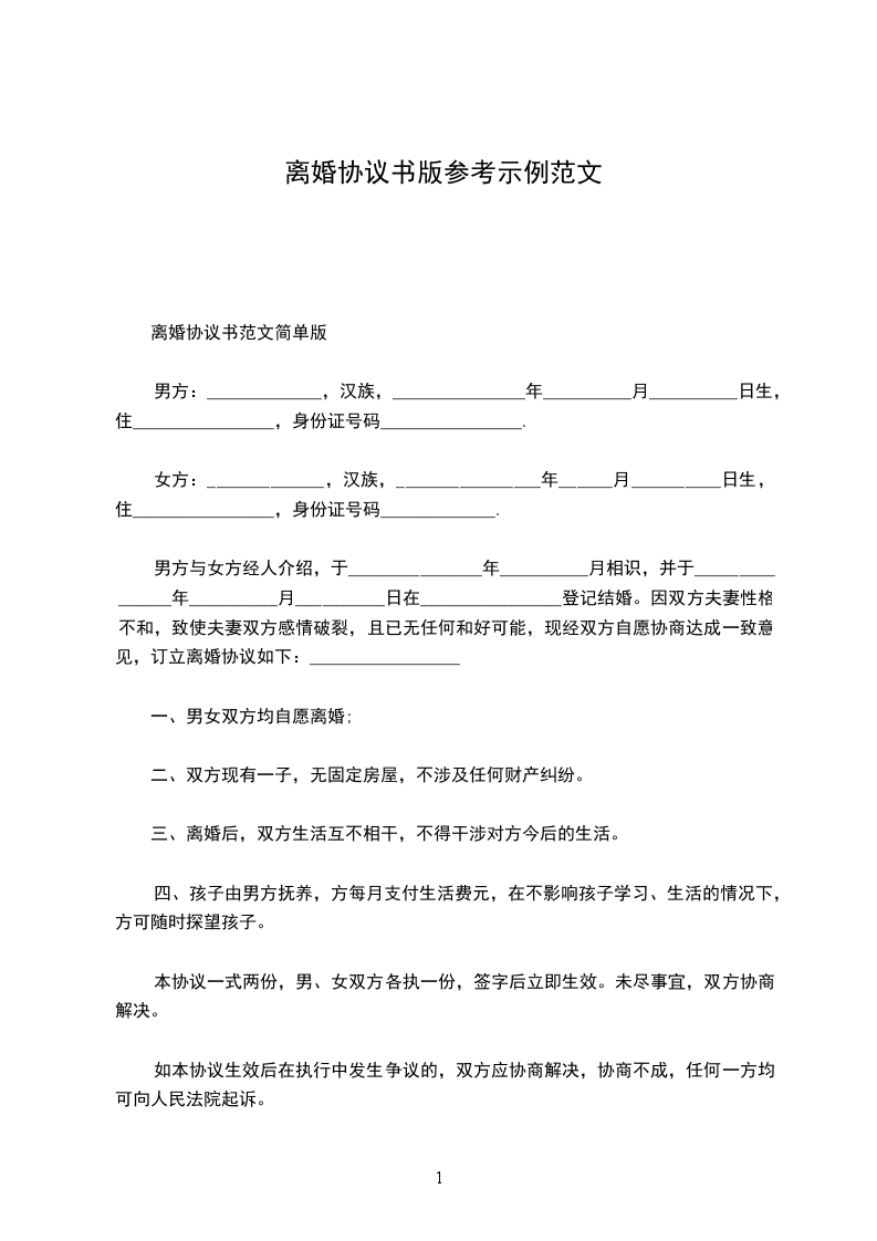 男方与女方__年__月认识,__年__月__日在登记结婚。婚后__年__月__日生育一子(女),名.因婚前缺乏必要了解,婚后性格不合难以建立夫妻感情,导致现在夫妻感情完全破裂,已无和好可能。现经夫妻双方自愿协商达成一致意见,订立离婚协议如下: