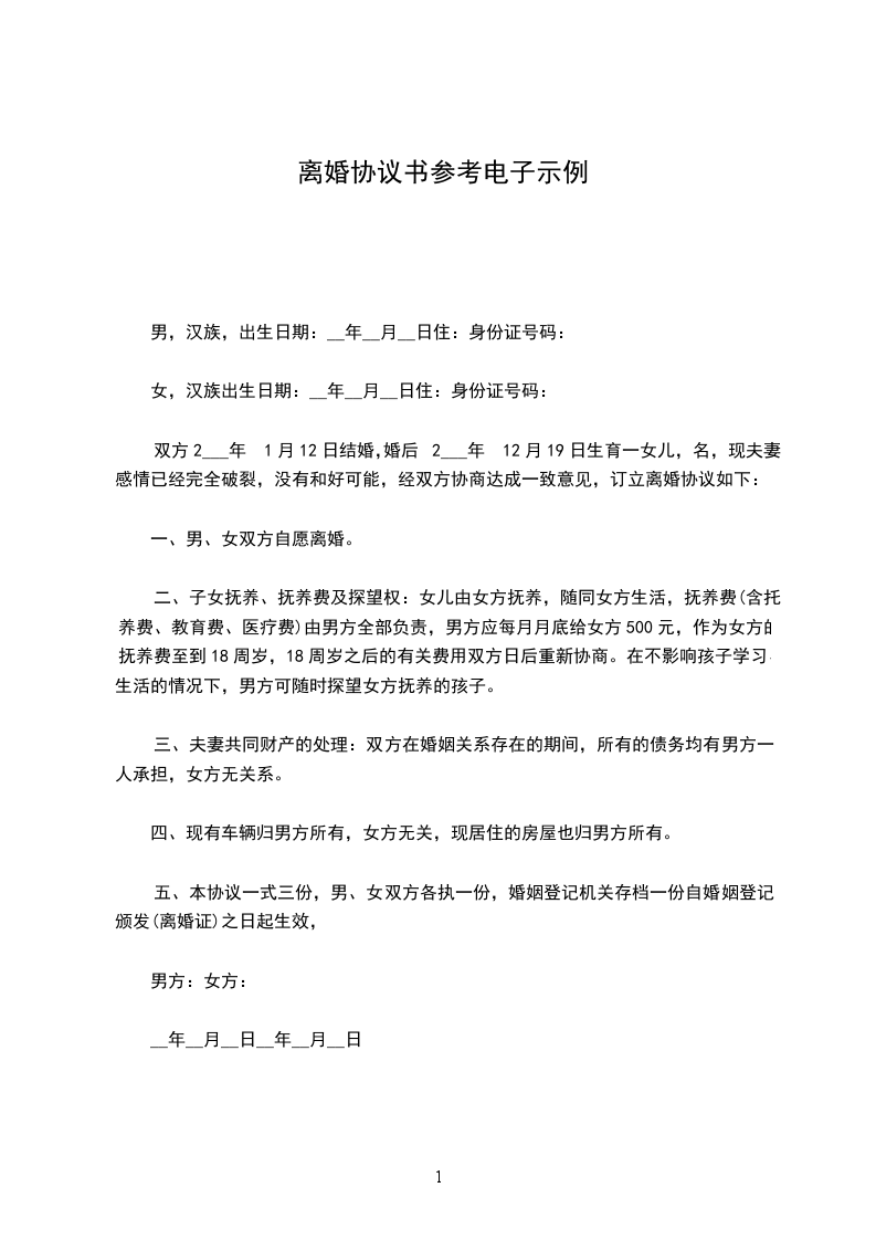 篇2男方:,男,汉族,__年__月__日出生,住.