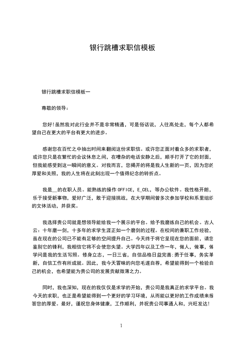银行跳槽求职信模板一