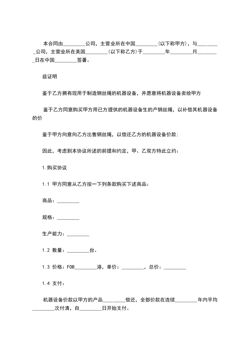 鉴于乙方同意购买甲方用已方提供的机器设备生的产钢丝绳,以补偿其机器设备的价