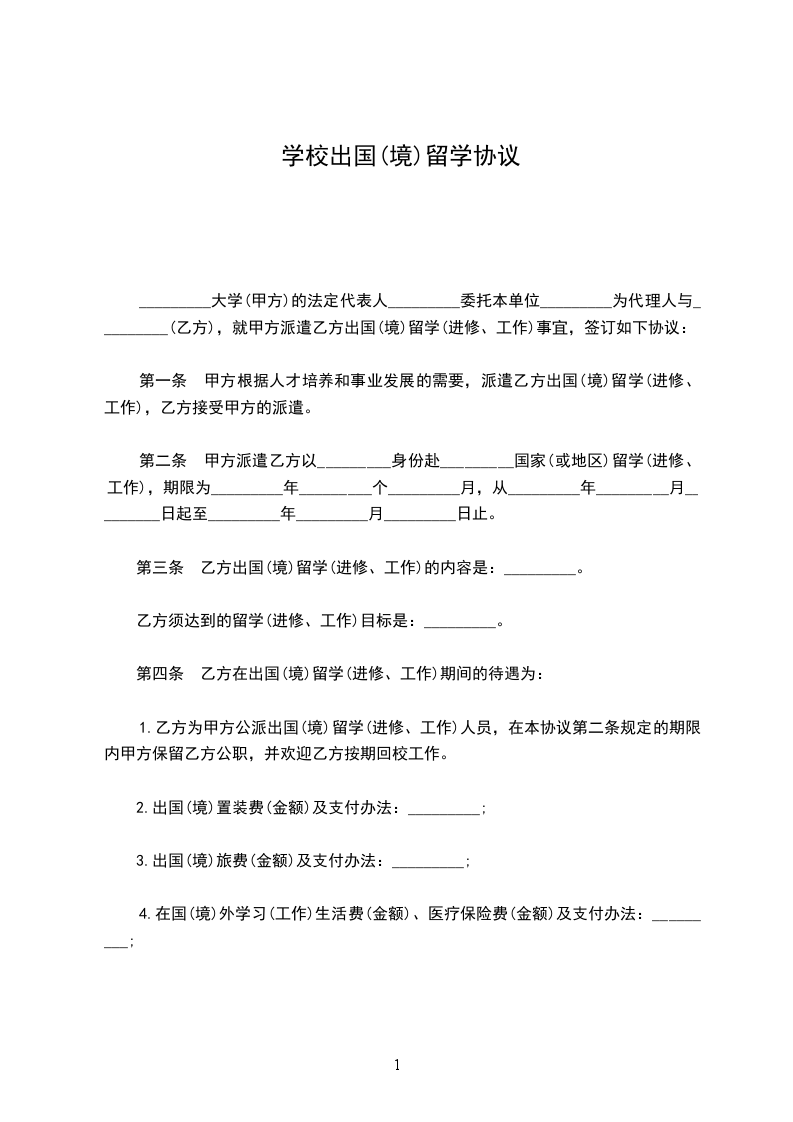 _________大学(甲方)的法定代表人_________委托本单位_________为代理人与_________(乙方),就甲方派遣乙方出国(境)留学(进修、工作)事宜,签订如下协议: