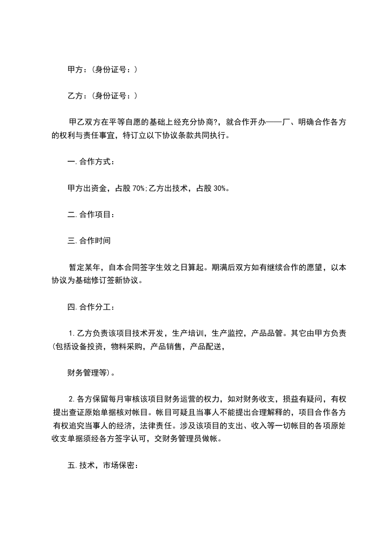1.乙方负责该项目技术开发,生产培训,生产监控,产品品管。其它由甲方负责(包括设备投资,物料采购,产品销售,产品配送,