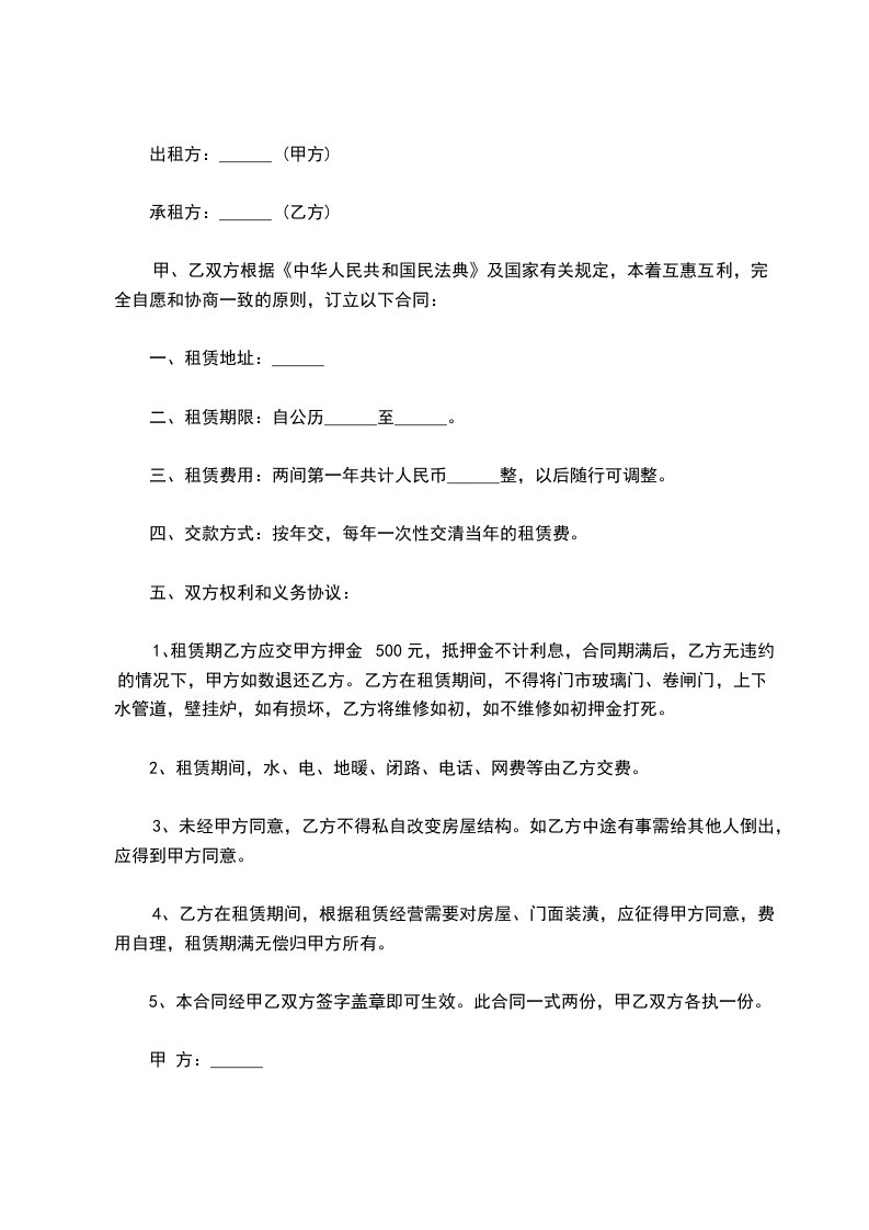 四、租金:每月_______元人民币,租房保证金______元人民币。