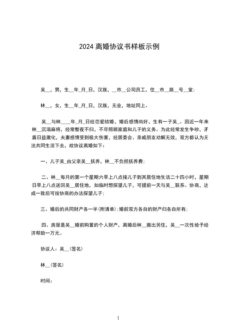 二、林__每月的第一个星期六早上八点接儿子到其居住地生活二十四小时,星期日早上八点送回吴__居住地,如临时想探望儿子,可提前一天与吴__联系、协商,达成一致后可按协商的办法探望儿子;