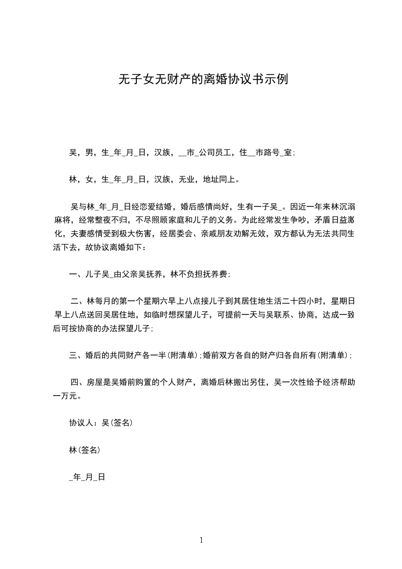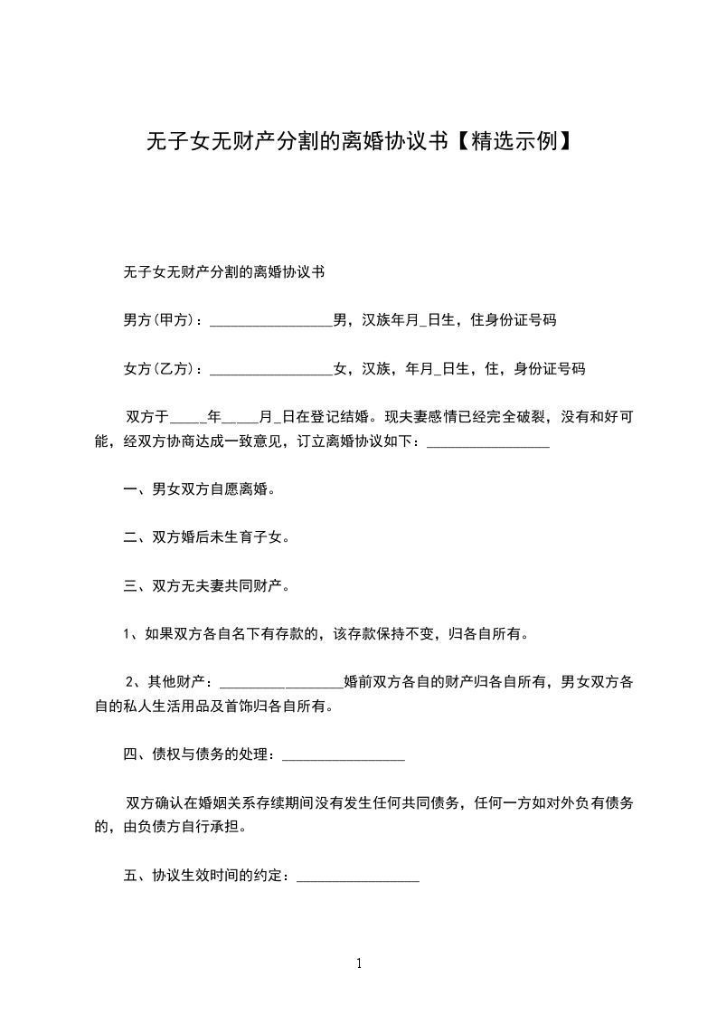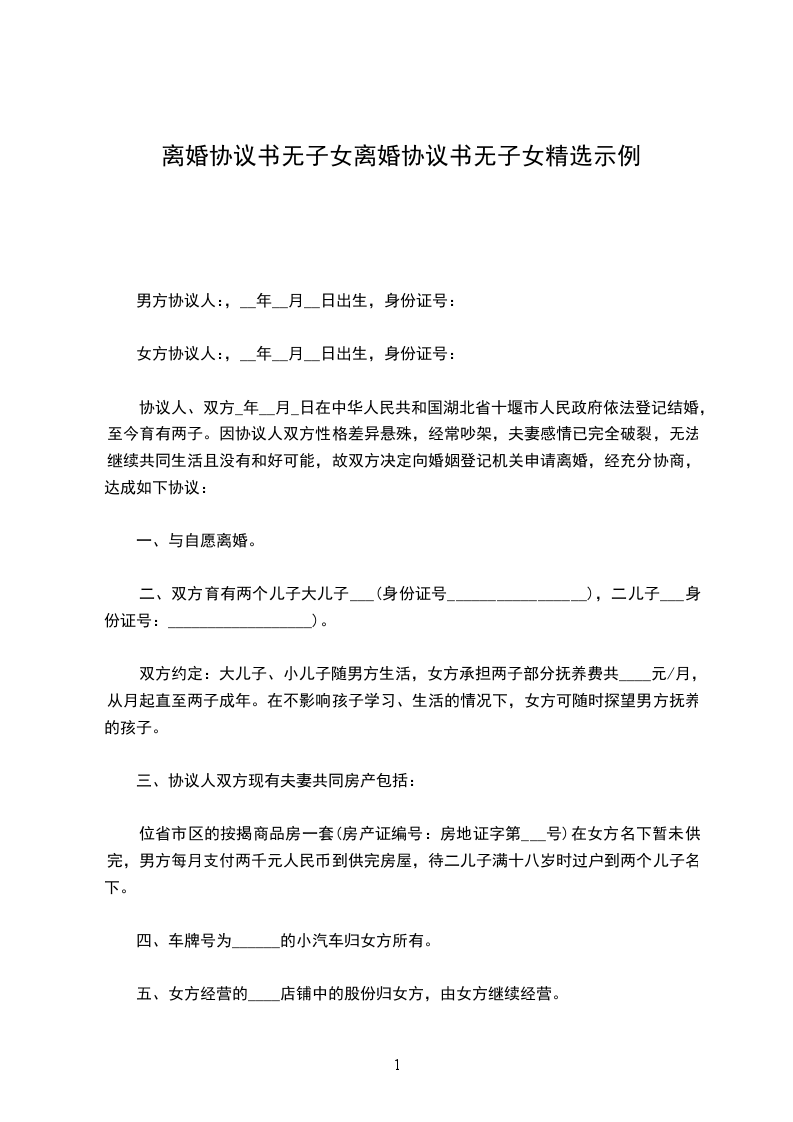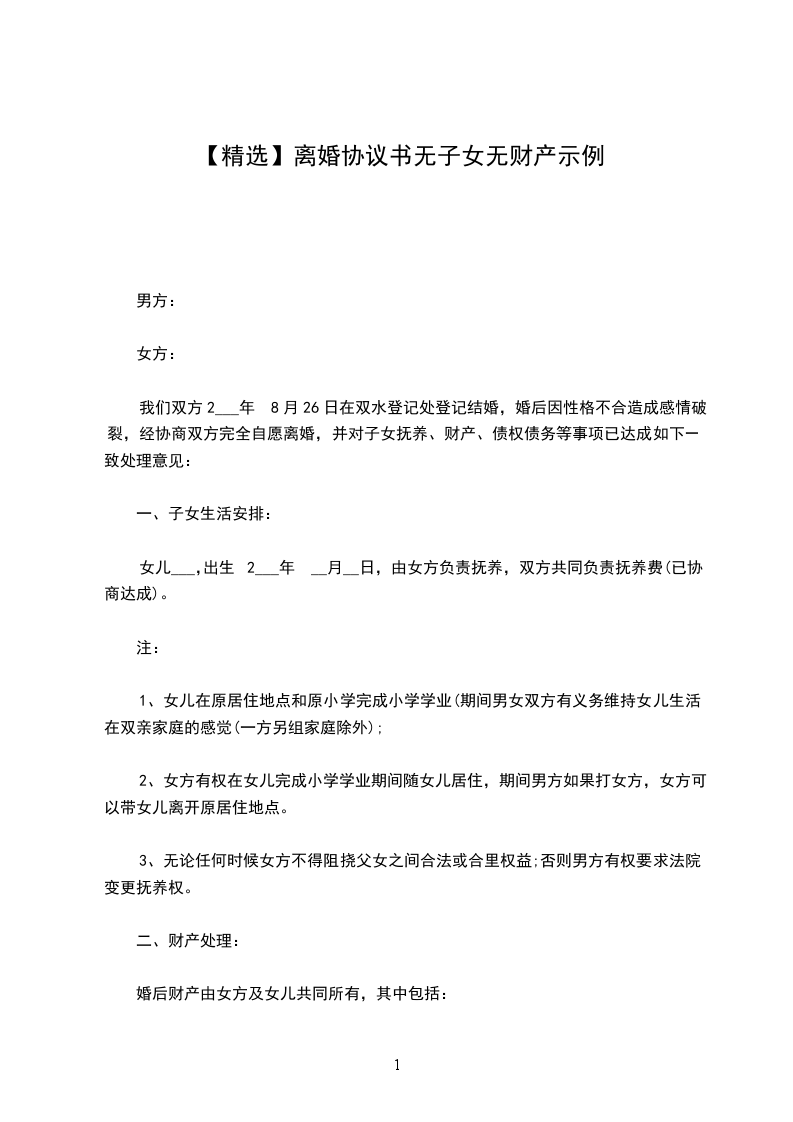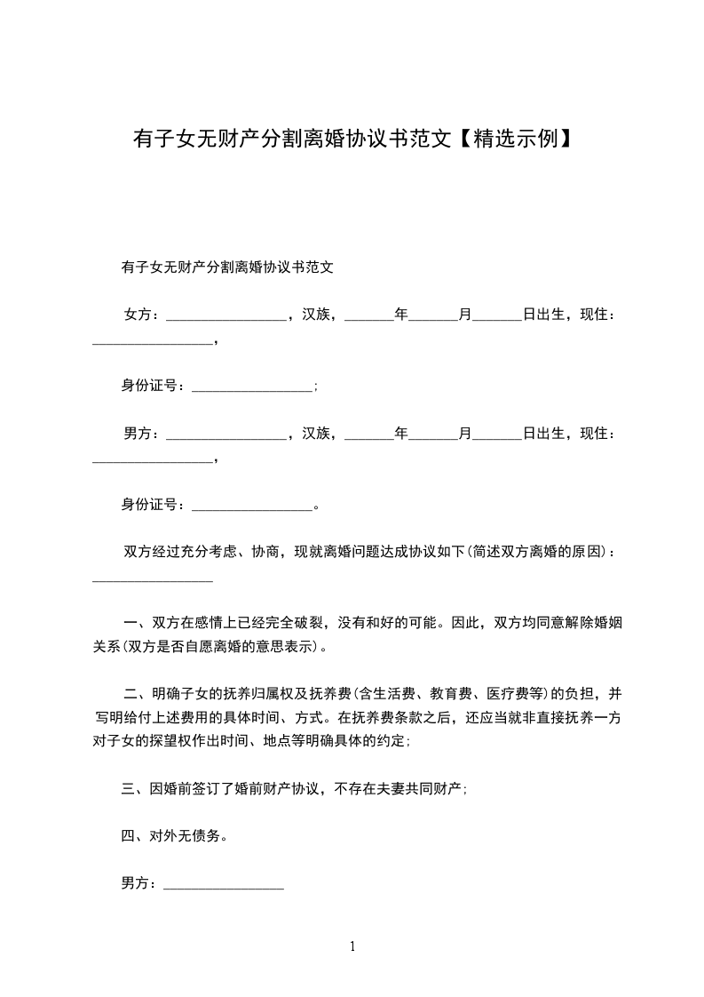 男方与女方_年_月认识,_年_月_日在登记结婚,婚后_年_月_日生育一儿子/女儿。因致使夫妻感情破裂,已无和好可能,现经夫妻双方自愿协商达成一致意见,订立离婚协议如下:
