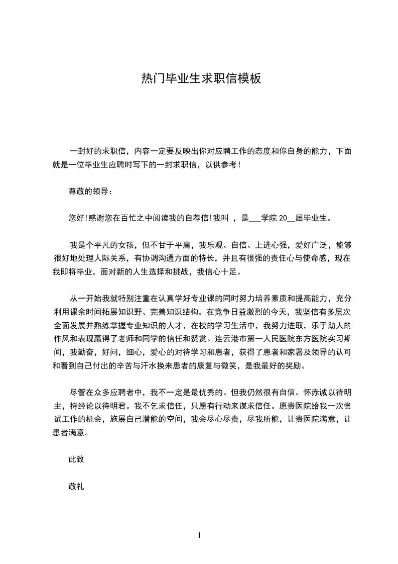 您好!感谢您在百忙之中阅读我的自荐信!我叫 ,是___学院20__届毕业生。