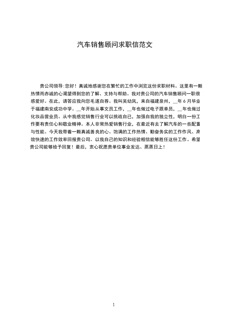 贵公司领导:您好!真诚地感谢您在繁忙的工作中浏览这份求职材料。这里有一颗热情而赤诚的心渴望得到您的了解、支持与帮助。我对贵公司的汽车销售顾问一职很感爱好。在此,请答应我向您毛遂自荐。我叫吴幼凤,来自福建泉州,__年6月毕业于福建南安成功中学。__年开始从事文员工作,__年也做过电子跟单员,__年也做过化妆品营业员。从中我感觉销售行业可以挑战自已,加强自我的独立性,明白一份工作要有责任心和敬业精神。本人非常热爱销售行业,在最近有去了解汽车的一些配置与性能。今天我带着一颗真诚善良的心、饱满的工作热情、勤奋务实的工作作风、高效快速的工作效率回报贵公司。以我自己的知识和经验相信能够胜任这份工作。希望贵公司能够给予回复!最后,衷心祝愿贵单位事业发达、蒸蒸日上!