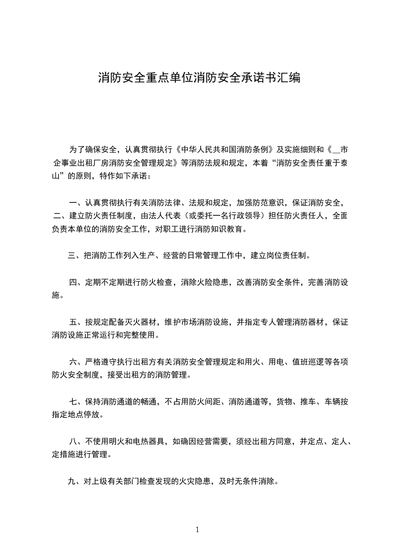 为了确保安全,认真贯彻执行《中华人民共和国消防条例》及实施细则和《__市企事业出租厂房消防安全管理规定》等消防法规和规定,本着“消防安全责任重于泰山”的原则,特作如下承诺: