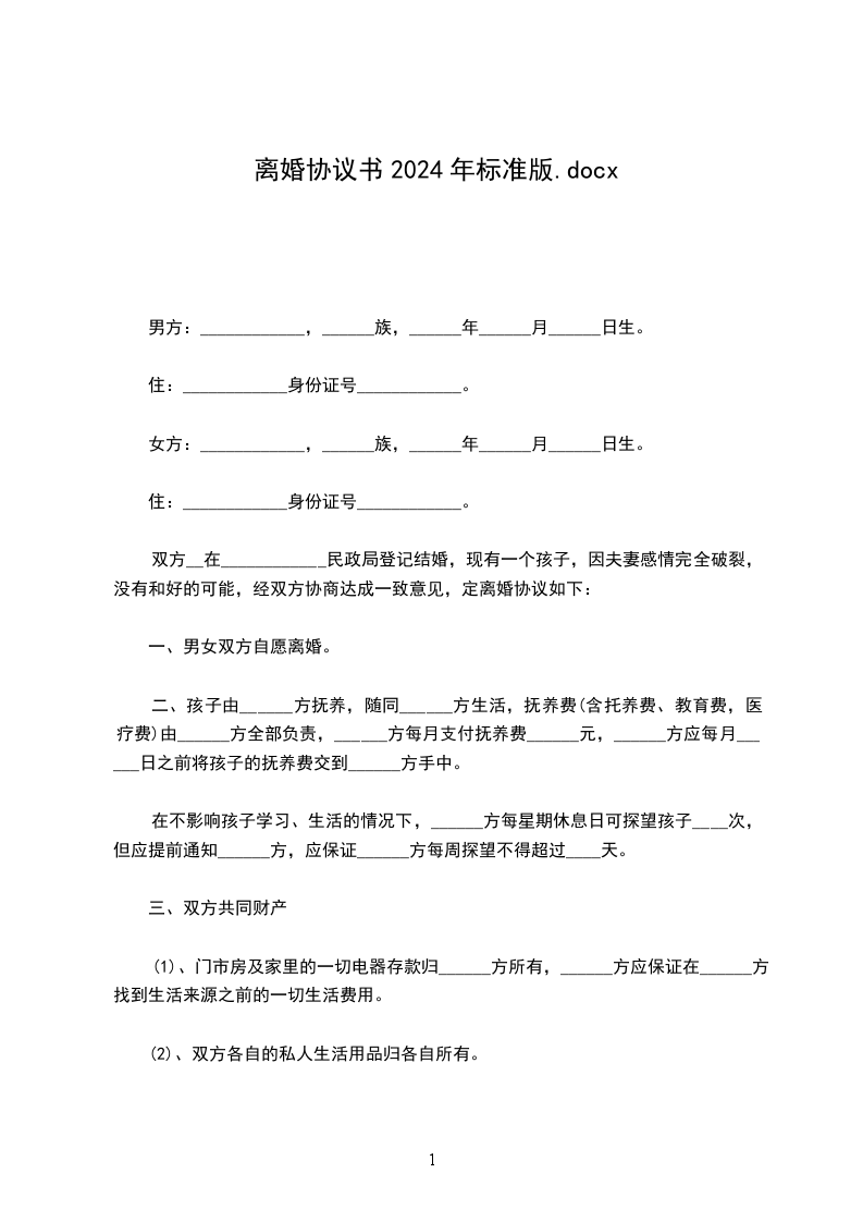 男方:张三,身份证号:_______,住_____省_____市_____区_____路_____栋_____单元______号。