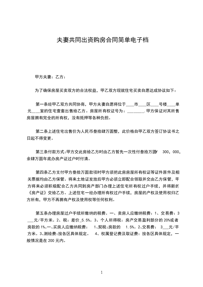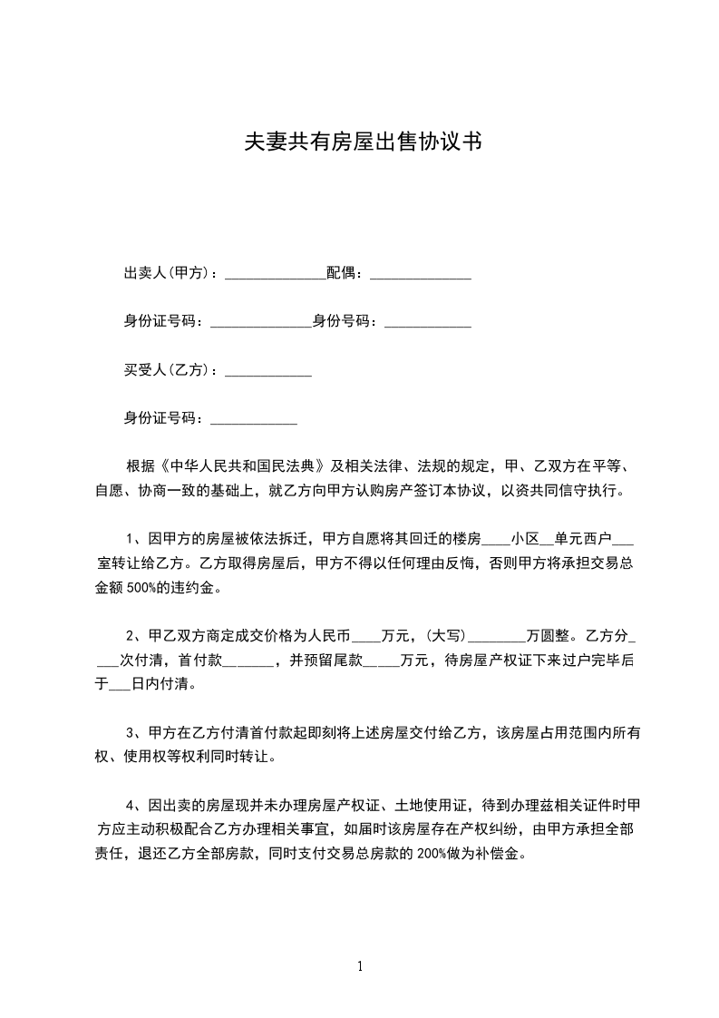 第一条经甲乙双方共同协商,甲方夫妻自愿将位于____市____区____号楼____单元____室的住宅壹套出售给乙方。房屋所有权证号为:________.甲方保证对其所售房屋拥有完全的所有权,没有抵押等各种负担。