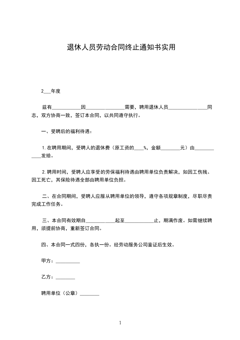 兹有______因________需要,聘用退休人员________同志,双方协商一致,签订本合同,以共同遵守执行。