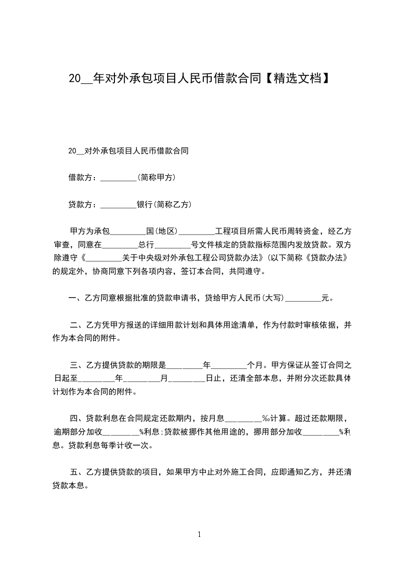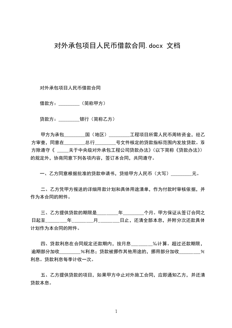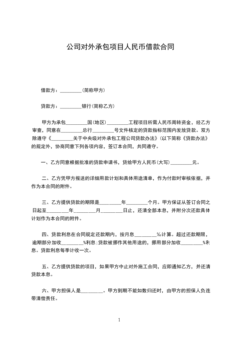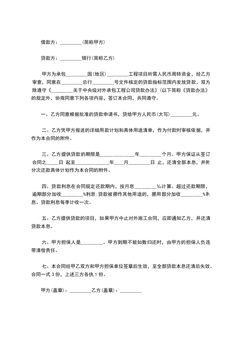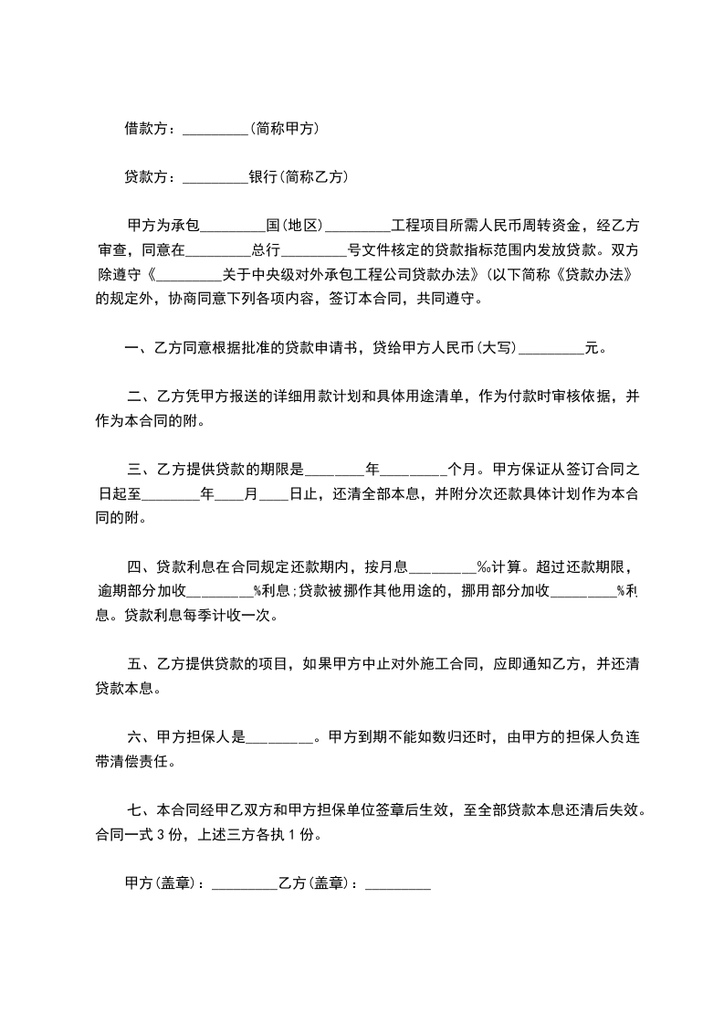 甲方为承包_________国(地区)_________工程项目所需人民币周转资金,经乙方审查,同意在_________总行_________号文件核定的贷款指标范围内发放贷款。双方除遵守《_________关于中央级对外承包工程公司贷款办法》(以下简称《贷款办法》)的规定外,协商同意下列各项内容,签订本合同,共同遵守。