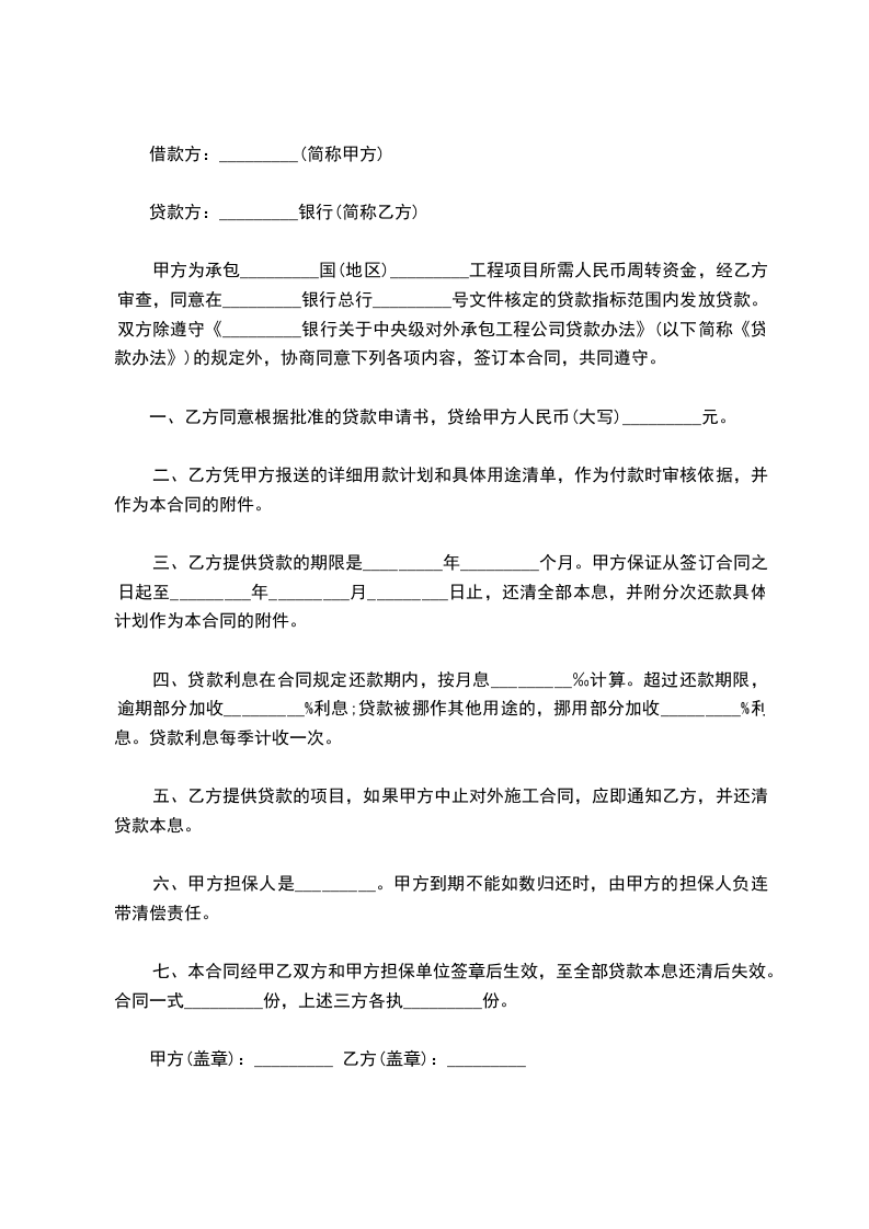 甲方为承包_________国(地区)_________工程项目所需人民币周转资金,经乙方审查,同意在_________银行总行_________号文件核定的贷款指标范围内发放贷款。双方除遵守《_________银行关于中央级对外承包工程公司贷款办法》(以下简称《贷款办法》)的规定外,协商同意下列各项内容,签订本合同,共同遵守。