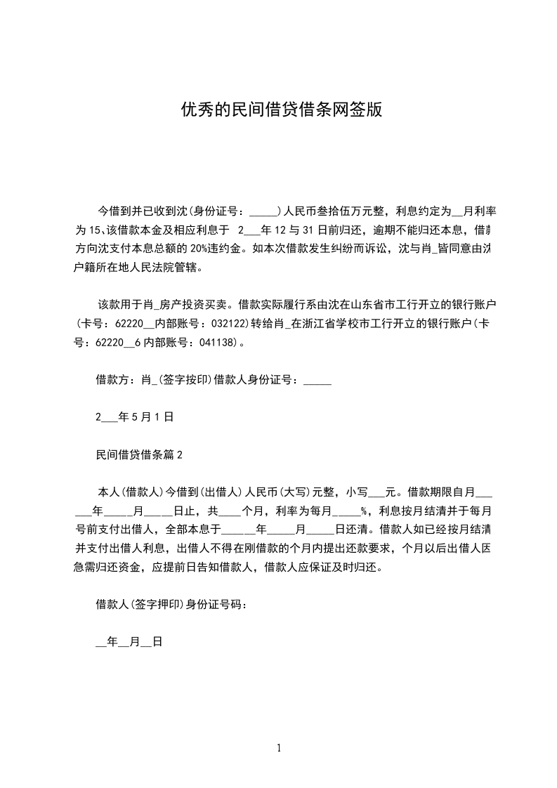 今借到并已收到沈(身份证号:_____)人民币叁拾伍万元整,利息约定为__月利率为15、该借款本金及相应利息于2___年12与31日前归还,逾期不能归还本息,借款方向沈支付本息总额的20%违约金。如本次借款发生纠纷而诉讼,沈与肖_皆同意由沈户籍所在地人民法院管辖。
