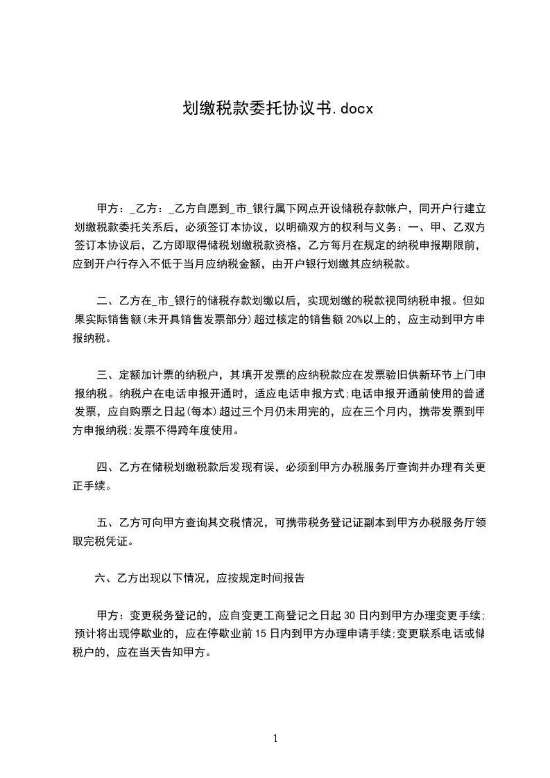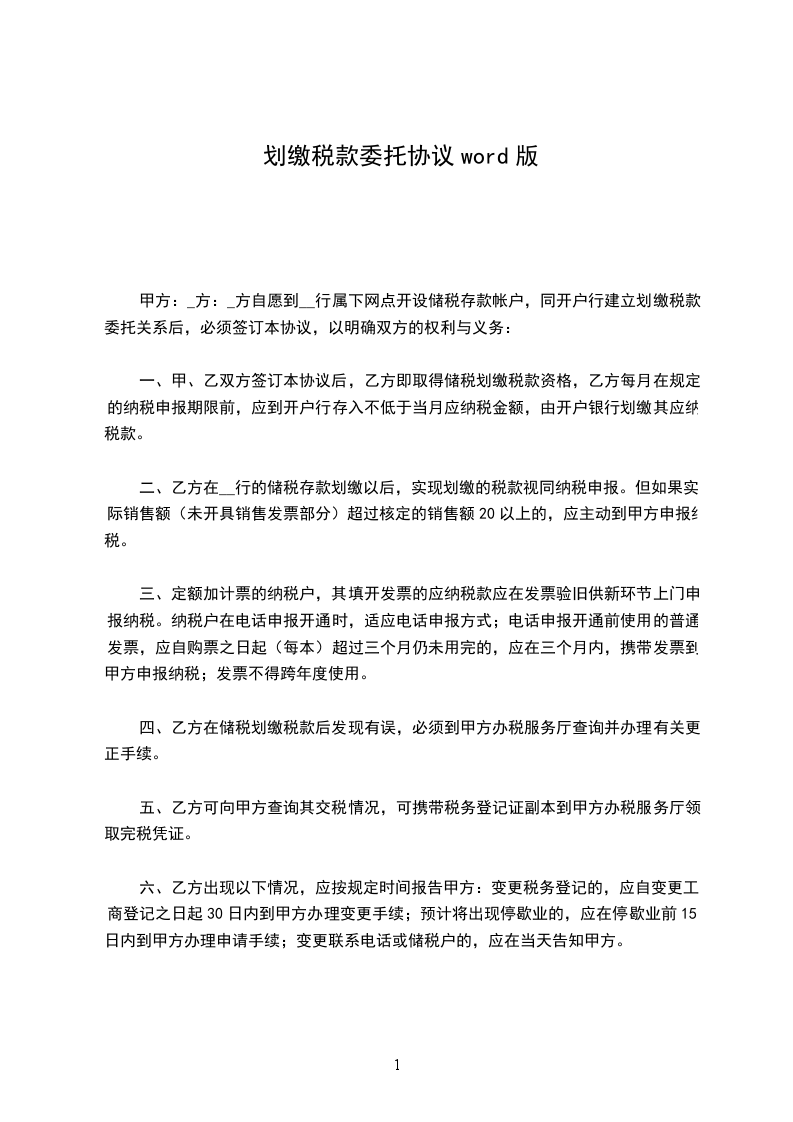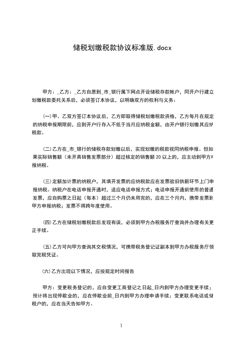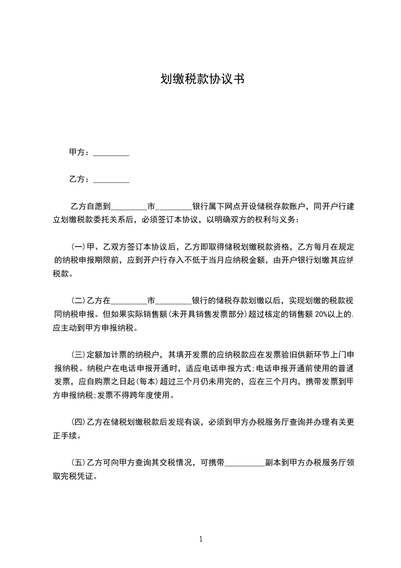 (一)甲、乙双方签订本协议后,乙方即取得储税划缴税款资格,乙方每月在规定的纳税申报期限前,应到开户行存入不低于当月应纳税金额,由开户银行划缴其应纳税款。