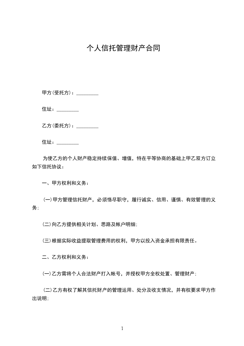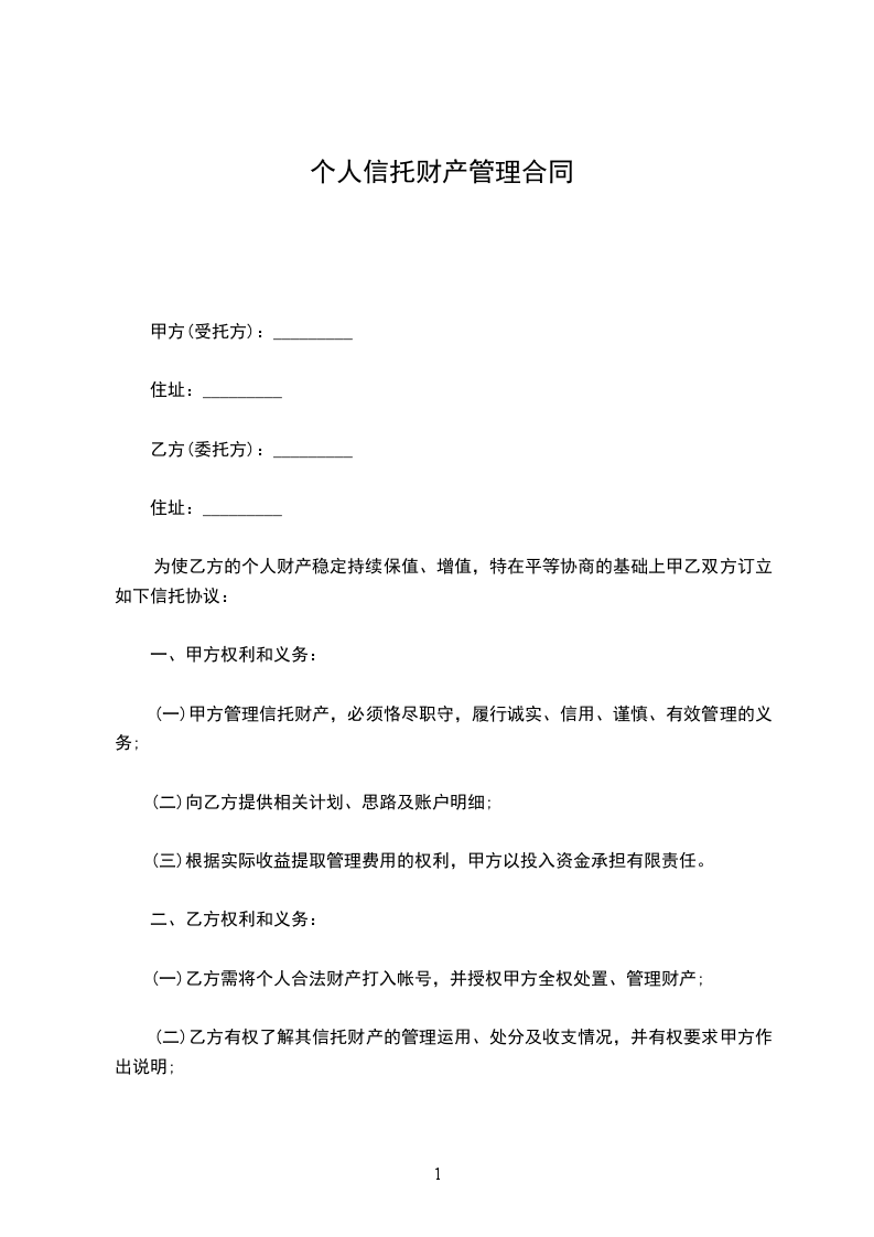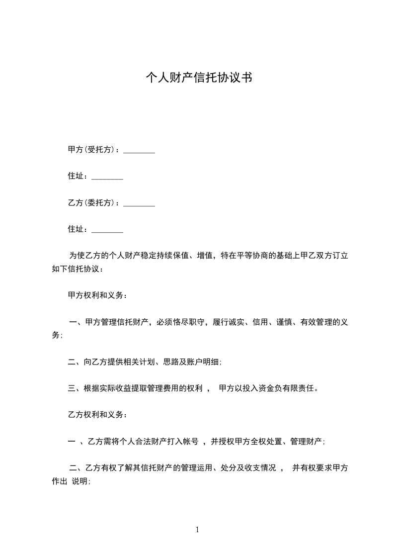 为使乙方的个人财产稳定持续保值、增值,特在平等协商的基础上甲乙双方订立如下信托协议: