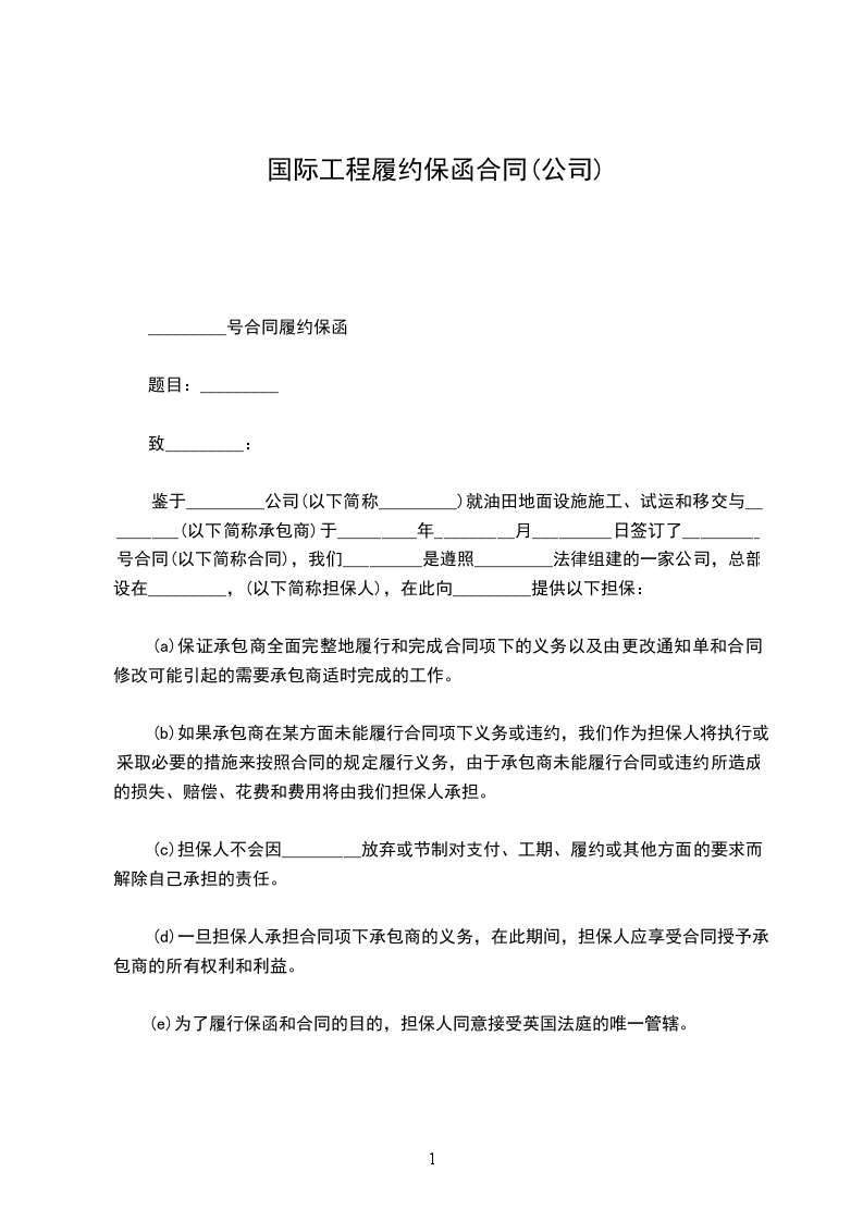 鉴于_________公司(以下简称_________)就油田地面设施施工、试运和移交与_________(以下简称承包商)于_________年_________月_________日签订了_________号合同(以下简称合同),我们_________是遵照_________法律组建的一家公司,总部设在_________,(以下简称担保人),在此向_________提供以下担保: