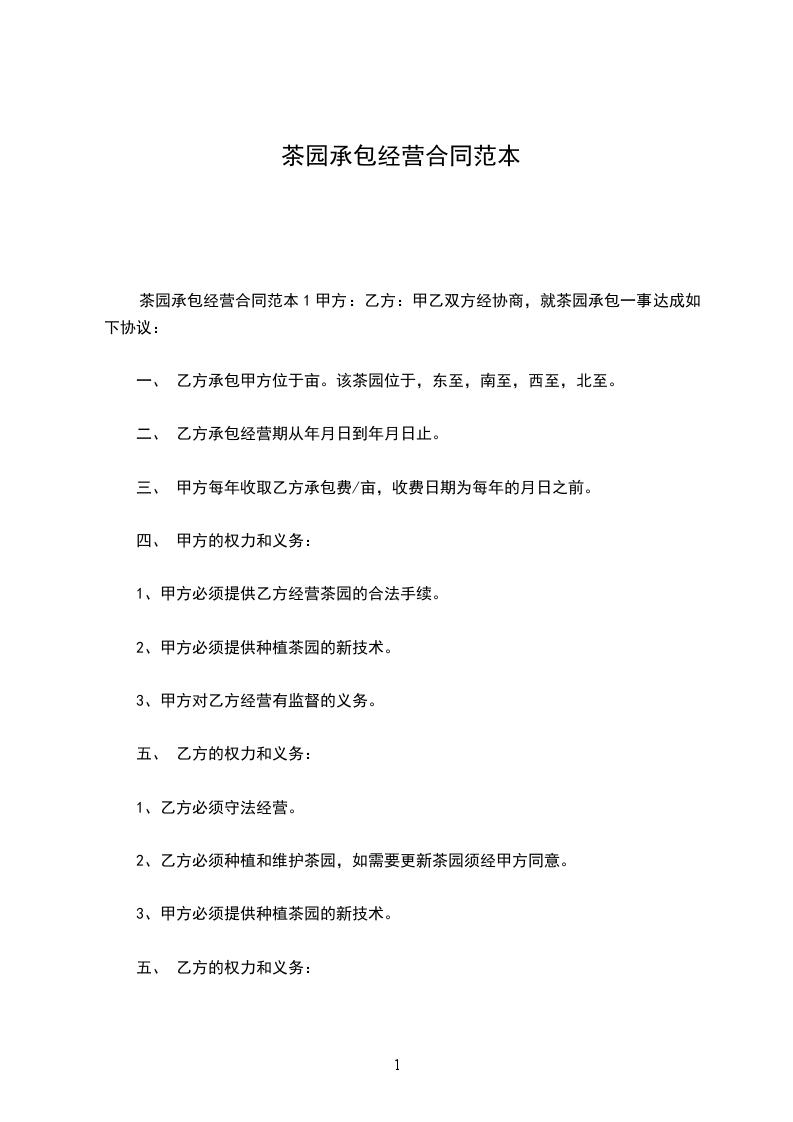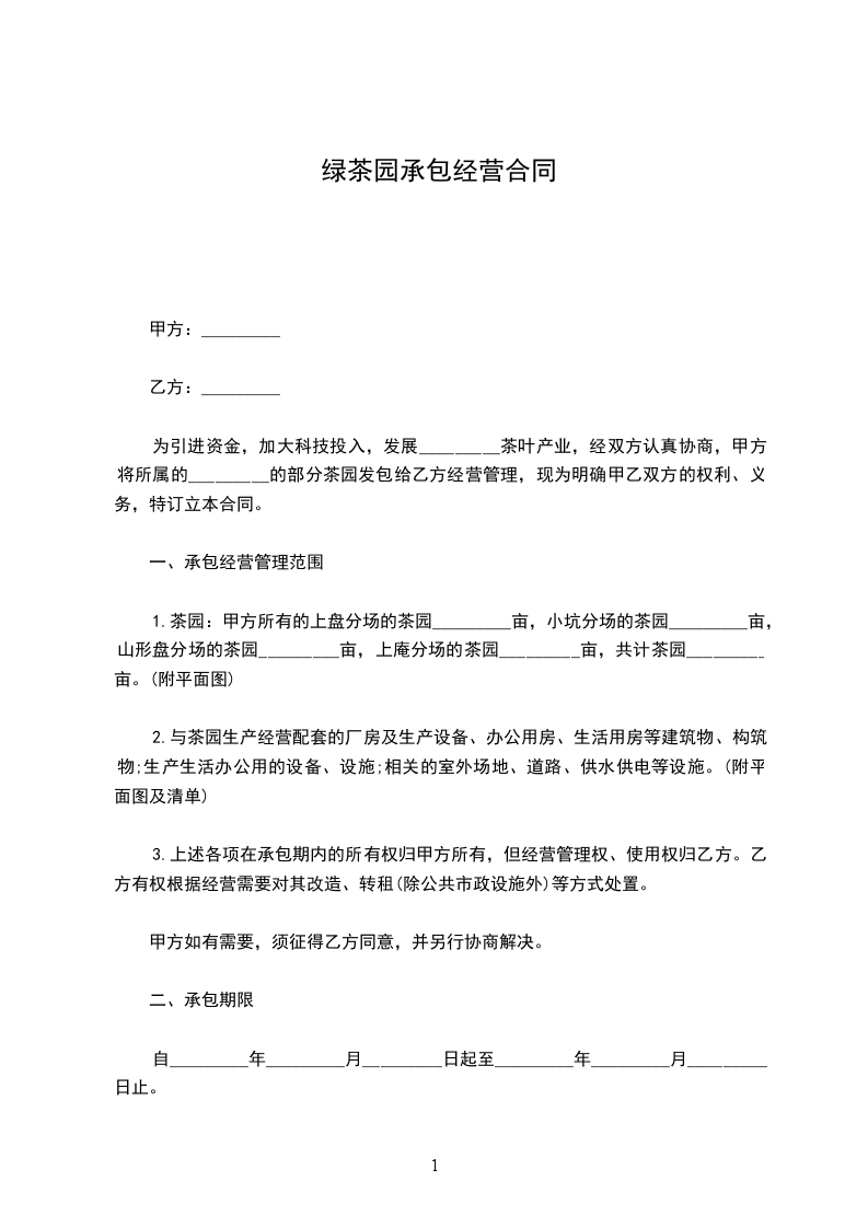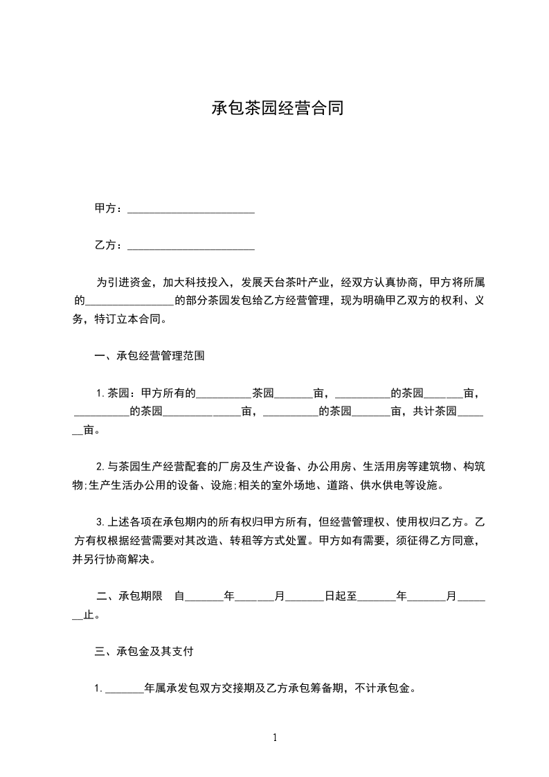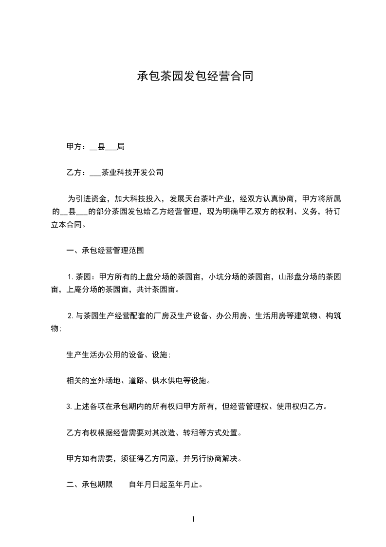 为引进资金,加大科技投入,发展_________茶叶产业,经双方认真协商,甲方将所属的_________的部分茶园发包给乙方经营管理,现为明确甲乙双方的权利、义务,特订立本合同。
