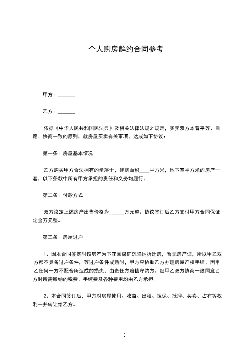 第五条甲方向乙方支付全款计人民币__元之后,并且双方签订解除该合同的文件生效后,乙方应授权甲方至市国土资源与房屋管理局(下称“房地局”)办理该合同注销登记手续之全部所需文件(包括签署递交房地局的解约合同、返还甲方开具的付款票据和合同等)。