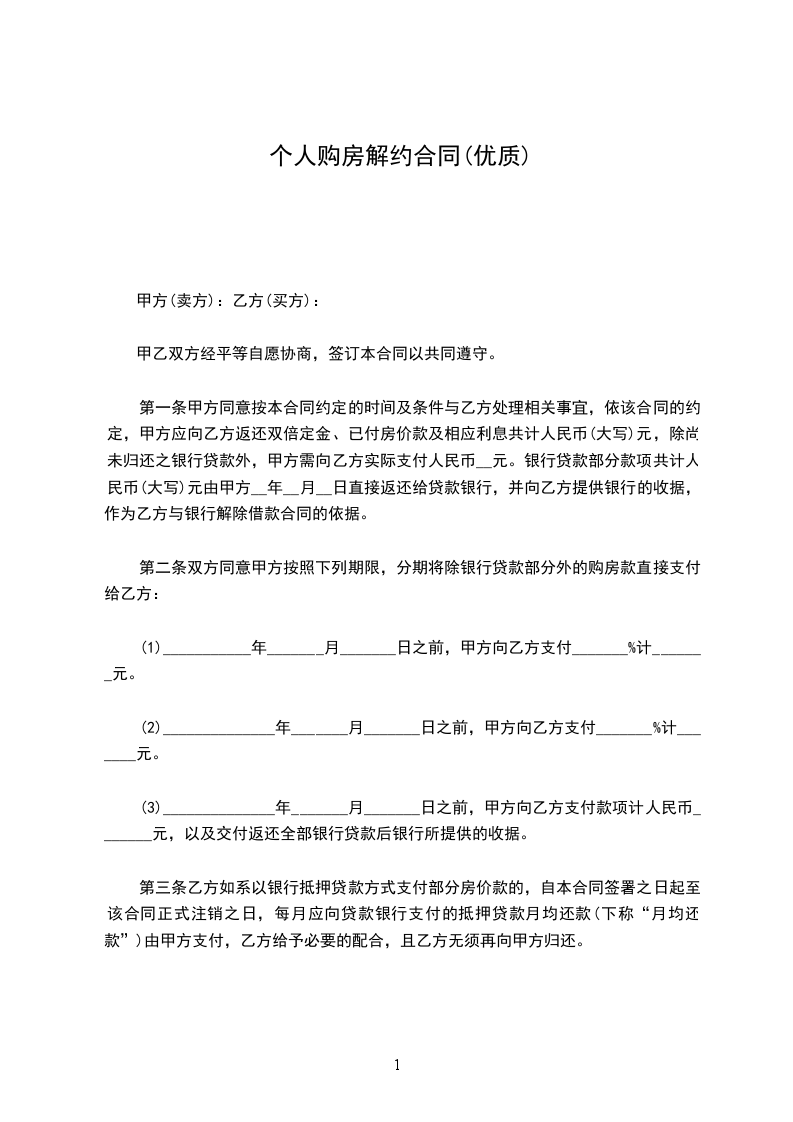 第一条甲方同意按本合同约定的时间及条件与乙方处理相关事宜,依该合同的约定,甲方应向乙方返还双倍定金、已付房价款及相应利息共计人民币(大写)元,除尚未归还之银行贷款外,甲方需向乙方实际支付人民币__元。银行贷款部分款项共计人民币(大写)元由甲方__年__月__日直接返还给贷款银行,并向乙方提供银行的收据,作为乙方与银行解除借款合同的依据。