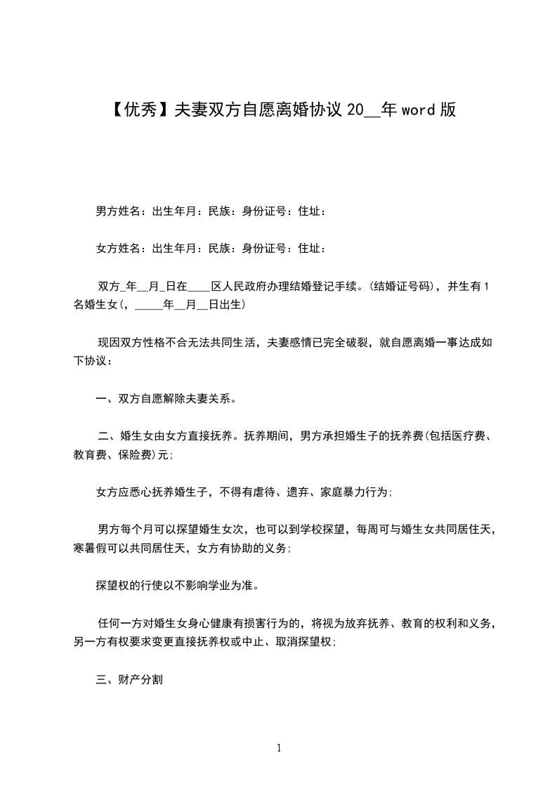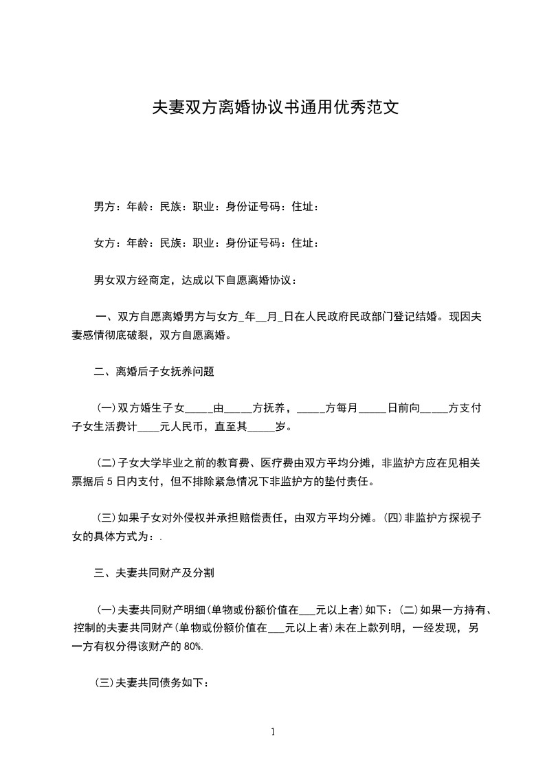 双方当事人:男方:,年龄:,民族:,职业:,身份证号码:住址:。女方:,年龄:,民族:,职业:,身份证号码:住址:。经商定,达成以下自愿离婚协议: