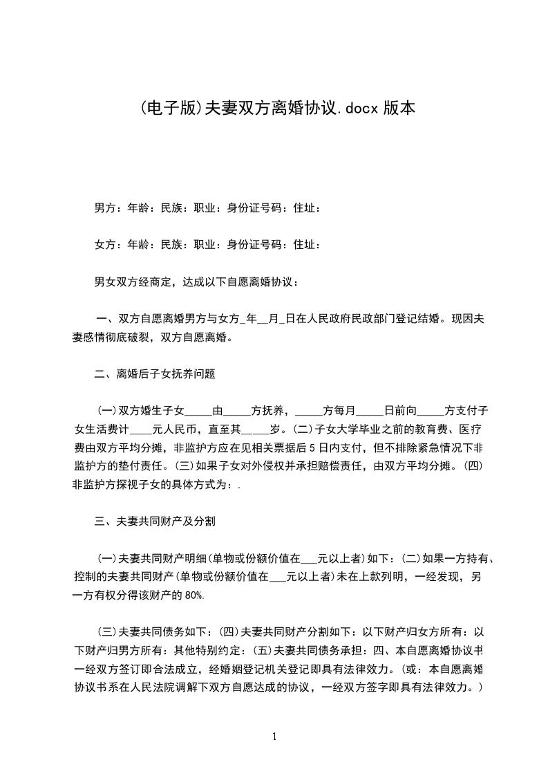 (三)夫妻共同债务如下:(四)夫妻共同财产分割如下:以下财产归女方所有:以下财产归男方所有:其他特别约定:(五)夫妻共同债务承担:四、本自愿离婚协议书一经双方签订即合法成立,经婚姻登记机关登记即具有法律效力。(或:本自愿离婚协议书系在人民法院调解下双方自愿达成的协议,一经双方签字即具有法律效力。)五、上述自愿离婚协议书事项,双方保证切实履行。因子女生活费、教育费、医疗费、对外赔偿等,延迟支付的一方应按日向全部垫付一方支付未支付金额千分之六的延期违约金。子女监护方阻止非监护方探视或不提供探视机会的,非监护方有权取得监护权,有权要求另一方支付精神损失赔偿金,精神损失赔偿金金额为监护方违约行为发生时的上年度全部收入。