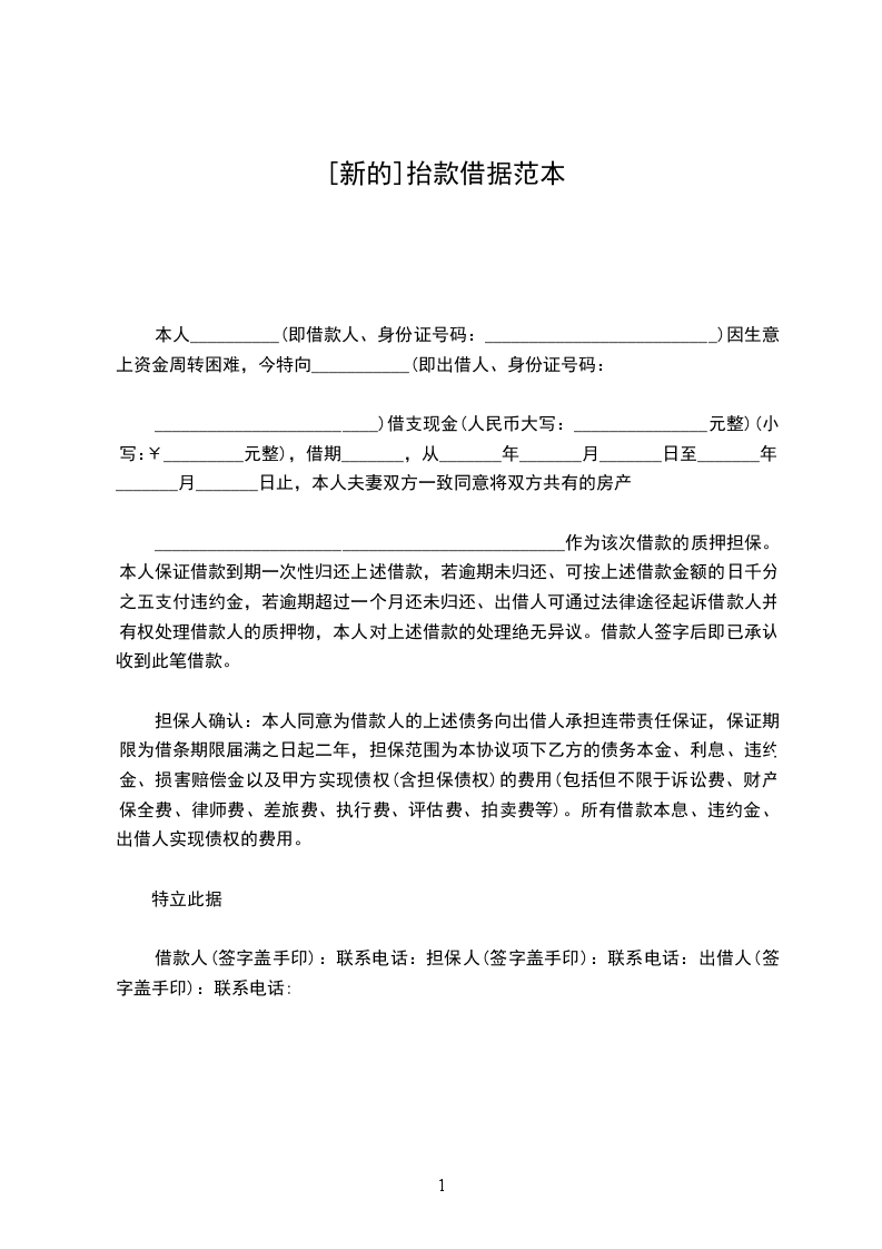 ______________________________________________作为该次借款的质押担保。本人保证借款到期一次性归还上述借款,若逾期未归还、可按上述借款金额的日千分之五支付违约金,若逾期超过一个月还未归还、出借人可通过法律途径起诉借款人并有权处理借款人的质押物,本人对上述借款的处理绝无异议。借款人签字后即已承认收到此笔借款。