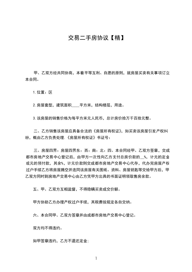 三、房屋四界:房屋四界东:西:南:北:四、本合同经甲、乙双方签章,交成都市房地产交易中心登记后,由甲方一次性向乙方支付总房价款的__%,计元的定金或元的预付款,其余%,计元价款则交成都市房地产交易中心代存,代办完房屋产权过户手续乙方将房屋腾空并连同该房屋有关图纸、资料、房屋钥匙等交给甲方后,甲、乙双方同时到房地产交易中心由乙方凭甲方出具的书面证明领取售房余款。