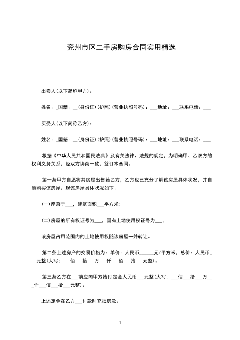 第二条上述房产的交易价格为:单价:人民币___________元/平方米,总价:人民币___________元整。本合同签定之日,乙方向甲方支付人民币__________元整,作为购房定金。
