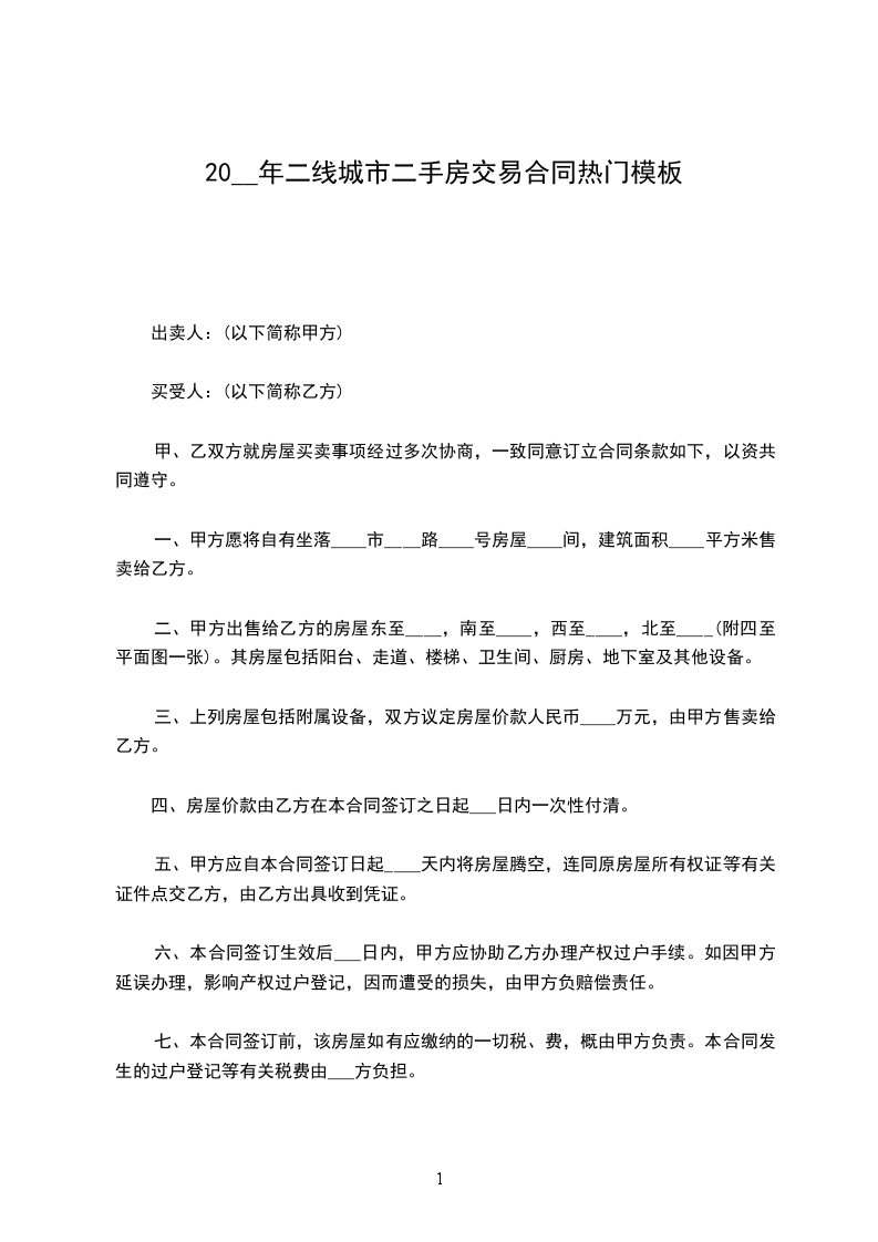 一、甲方自愿将坐落于区号房产卖给乙方,房屋用途:住宅,所有权证书号,房屋的建筑面积为:平方米。经双方协商,房屋总价为人民币:。(¥)