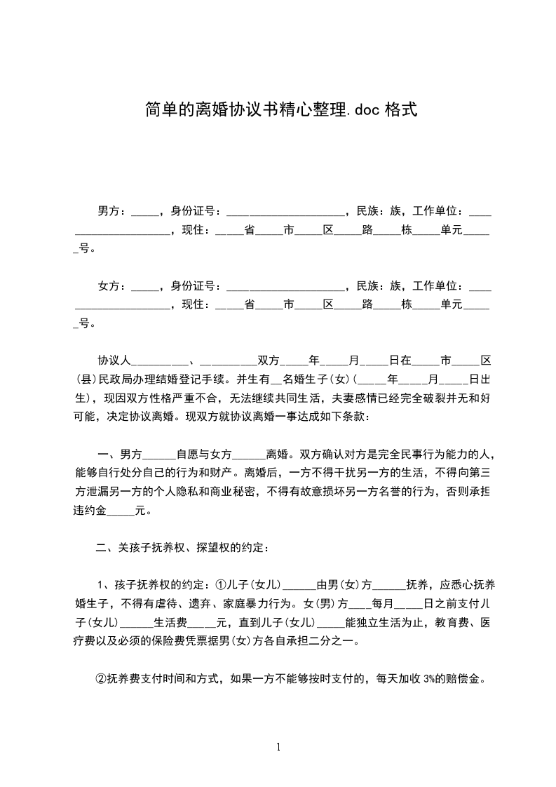 一、男方______自愿与女方______离婚。双方确认对方是完全民事行为能力的人,能够自行处分自己的行为和财产。离婚后,一方不得干扰另一方的生活,不得向第三方泄漏另一方的个人隐私和商业秘密,不得有故意损坏另一方名誉的行为,否则承担违约金_____元。