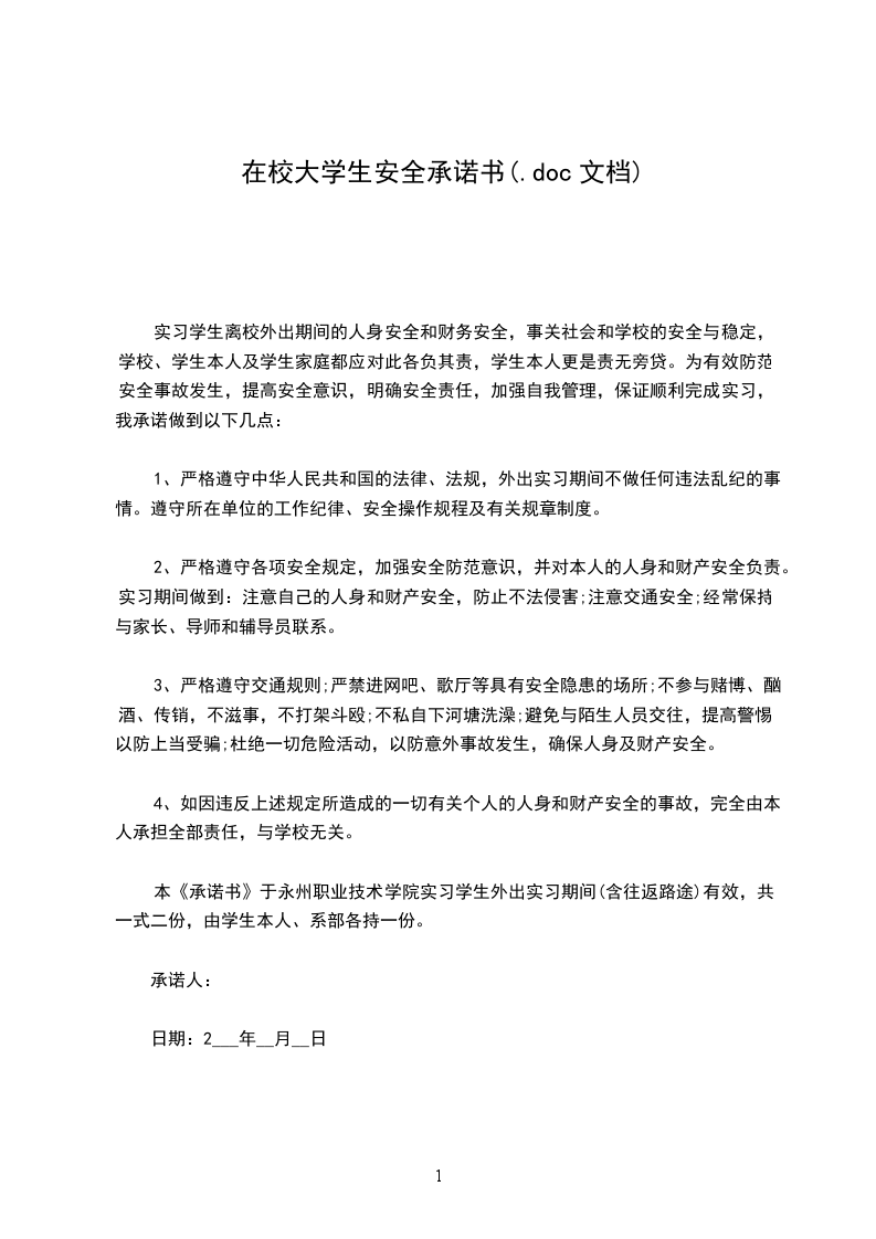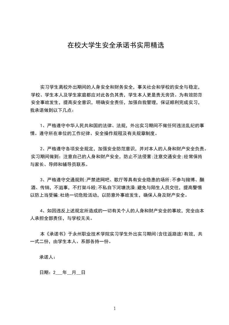 本《承诺书》于永州职业技术学院实习学生外出实习期间(含往返路途)有效,共一式二份,由学生本人、系部各持一份。
