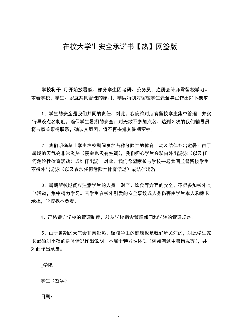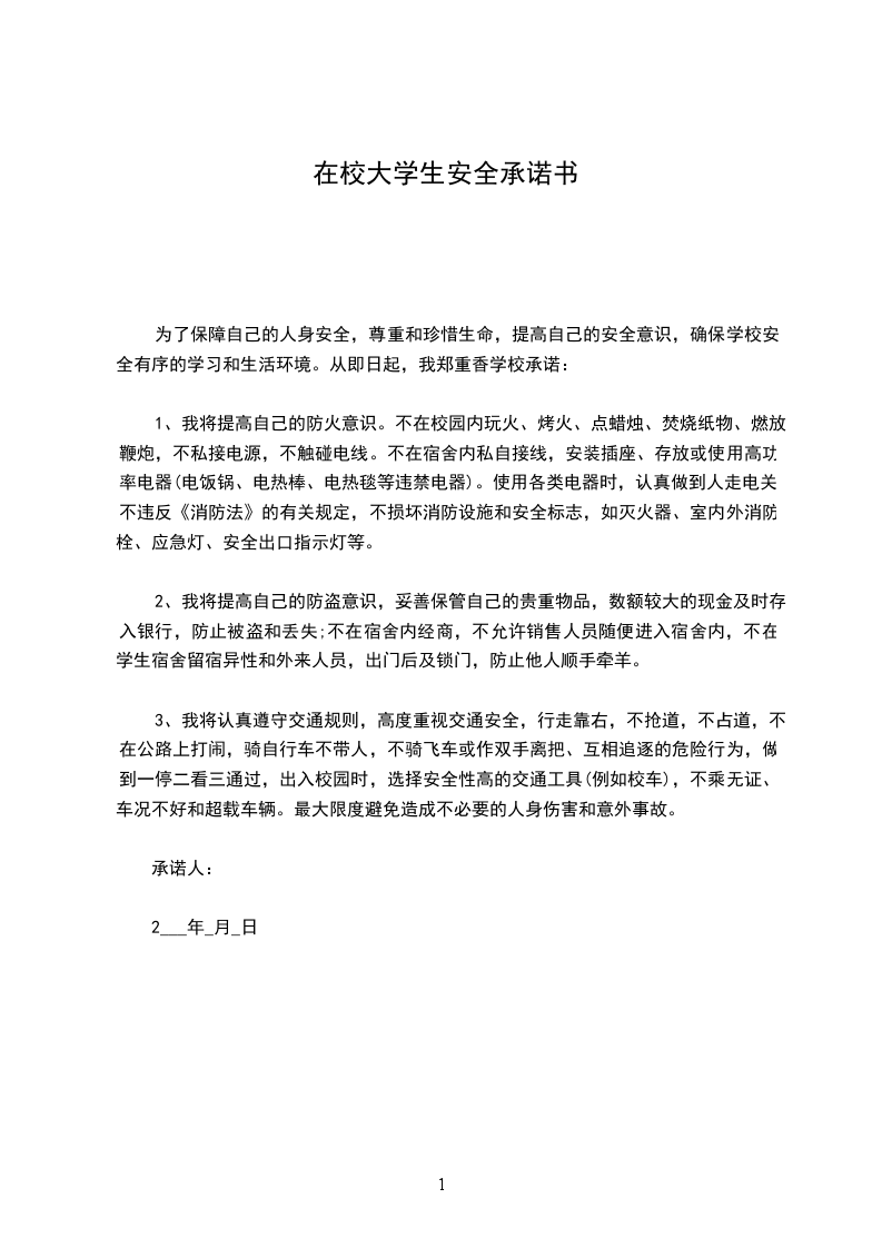 实习学生离校外出期间的人身安全和财务安全,事关社会和学校的安全与稳定,学校、学生本人及学生家庭都应对此各负其责,学生本人更是责无旁贷。为有效防范安全事故发生,提高安全意识,明确安全责任,加强自我管理,保证顺利完成实习,我承诺做到以下几点:
