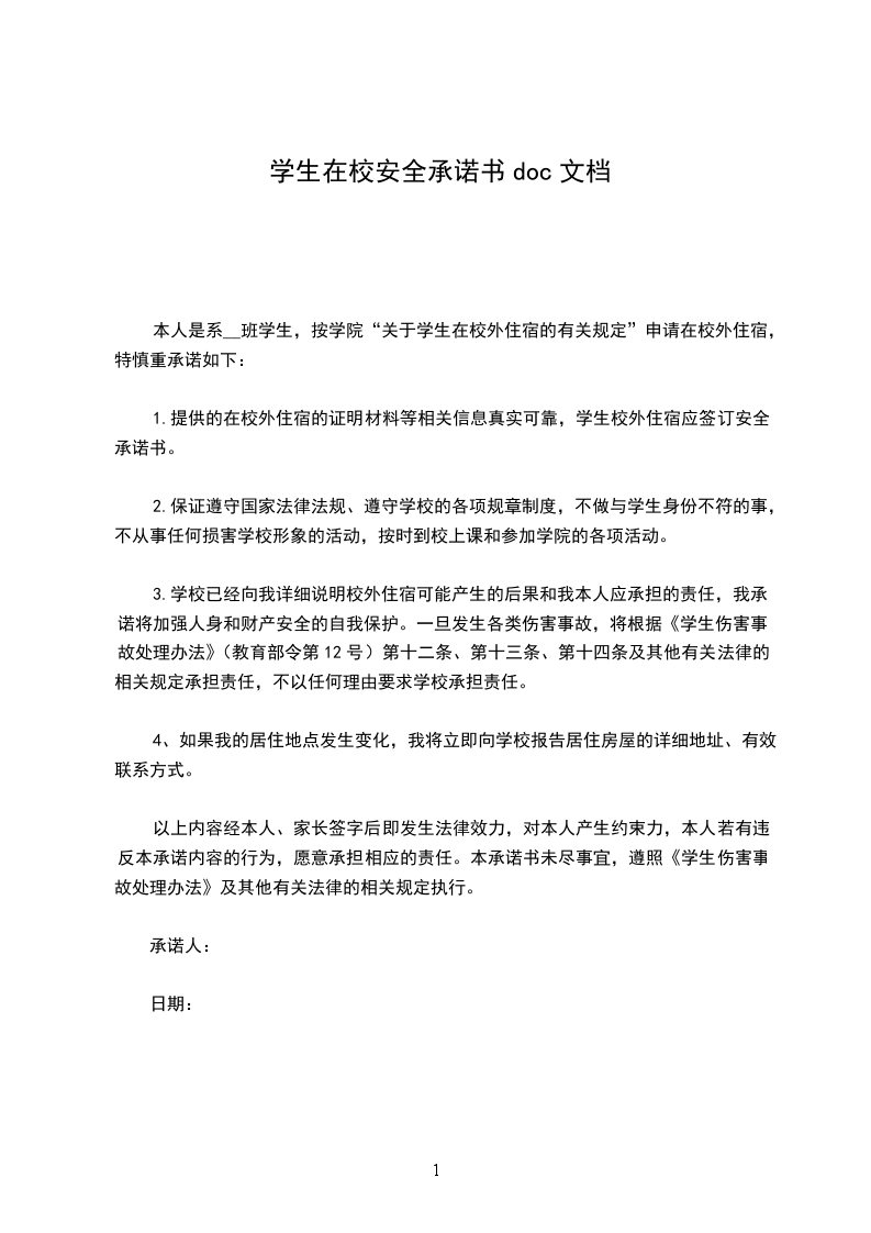 4、如因违反上述规定所造成的一切有关个人的人身和财产安全的事故,完全由本人承担全部责任,与学校无关。