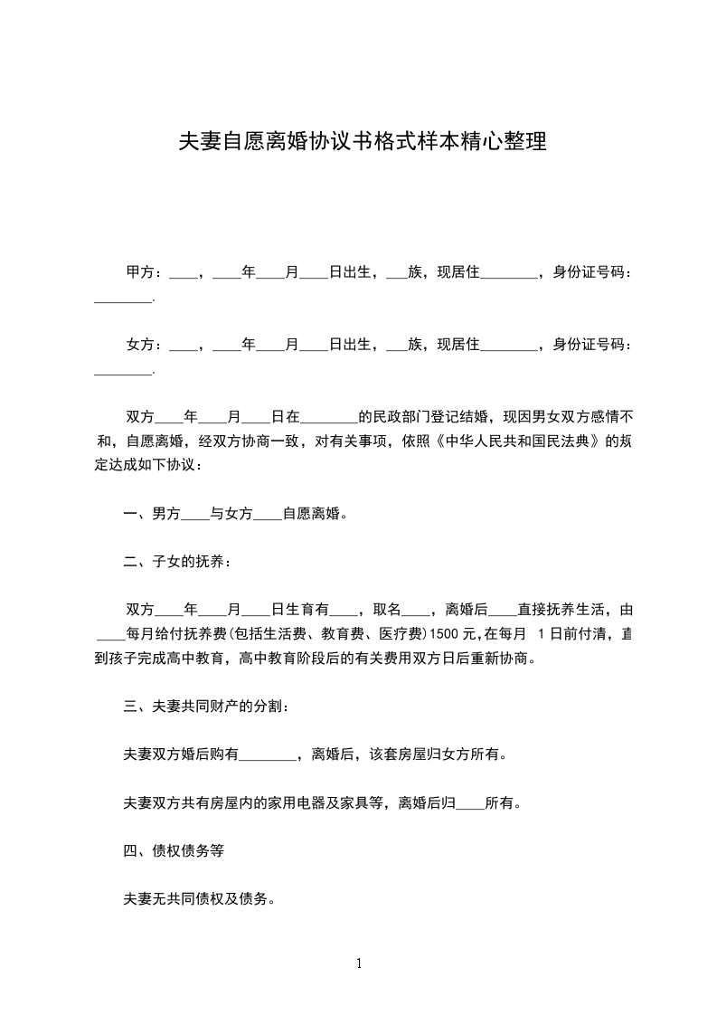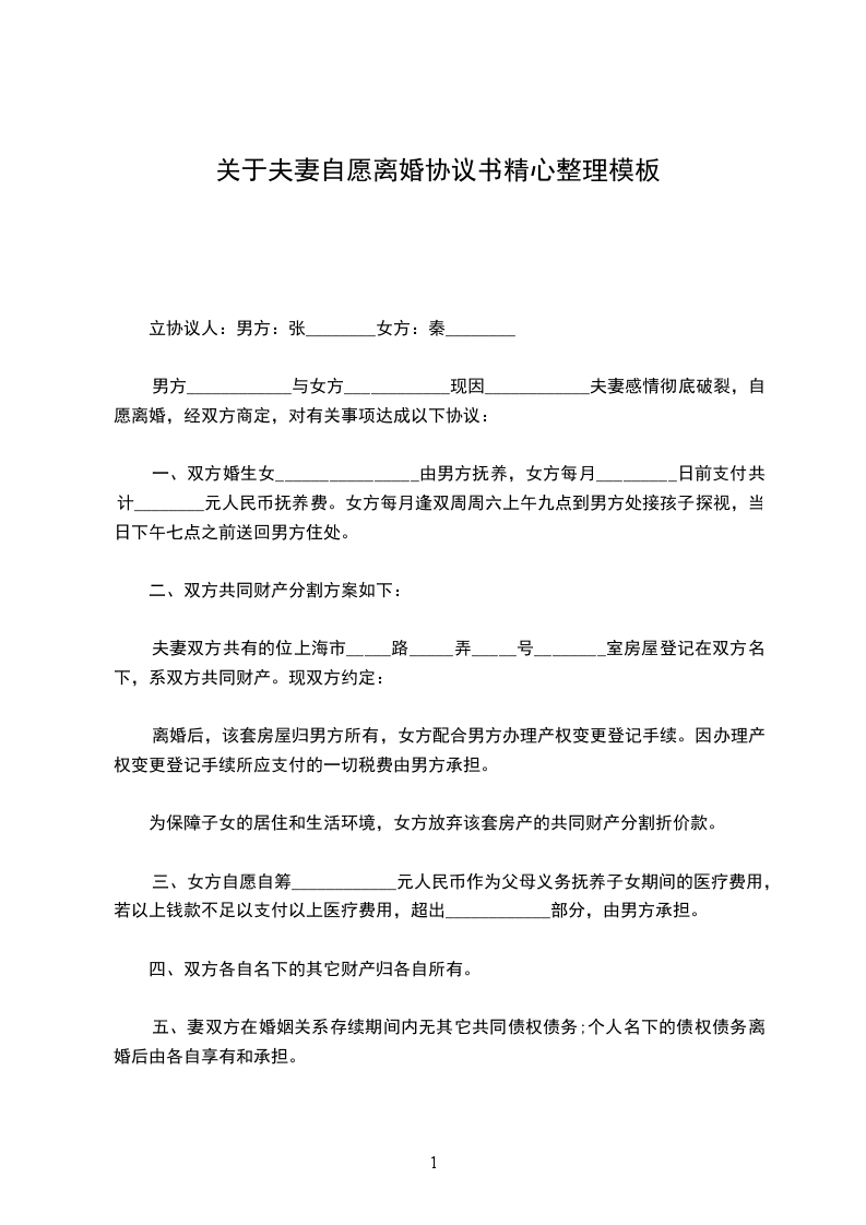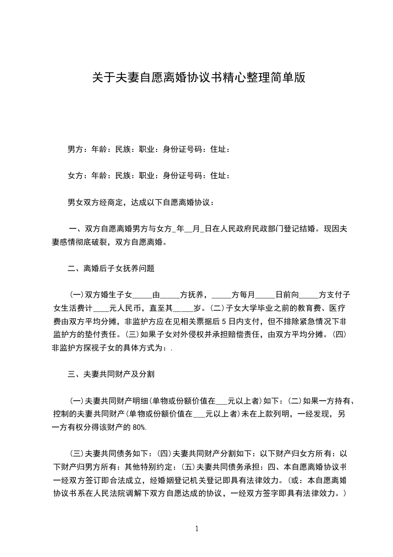 一、男、女双方自愿离婚,解除婚姻关系。