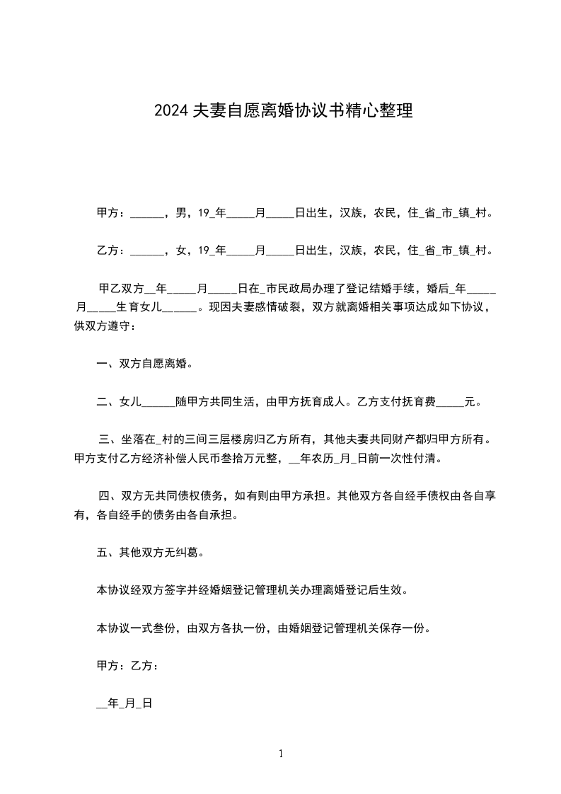 1、本协议一式三份,由双方签字后生效,双方各执一份,另一份交由民政部门办理离婚手续。