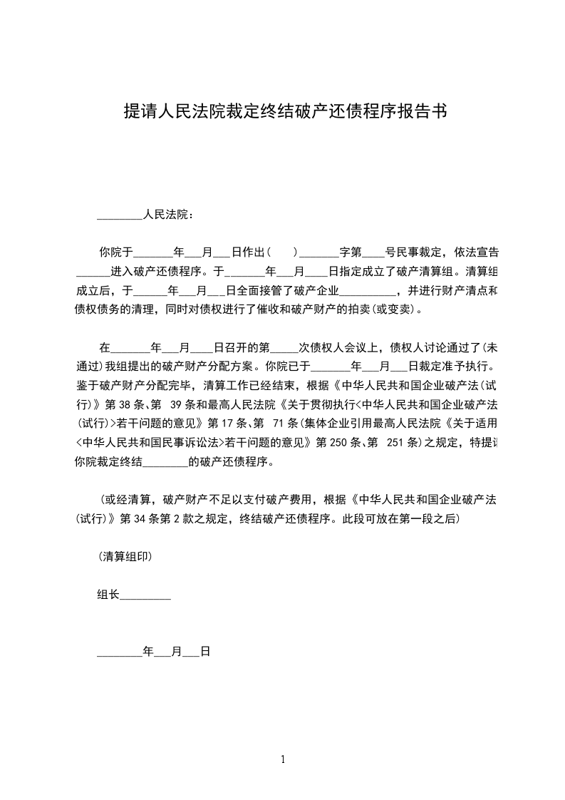 在_______年___月____日召开的第_____次债权人会议上,债权人讨论通过了(未通过)我组提出的破产财产分配方案。你院已于_______年___月___日裁定准予执行。鉴于破产财产分配完毕,清算工作已经结束,根据《中华人民共和国企业破产法(试行)》第38条、第39条和最高人民法院《关于贯彻执行若干问题的意见》第17条、第71条(集体企业引用最高人民法院《关于适用若干问题的意见》第250条、第251条)之规定,特提请你院裁定终结________的破产还债程序。