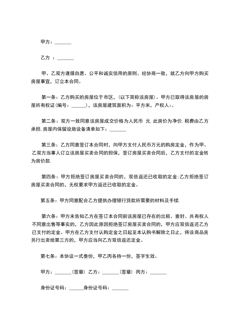 第三条1.甲、乙双方约定于______年____月____日之前签订正式的合同,如甲、乙任何一方未按时签订正式买卖合同,则视为违约。
