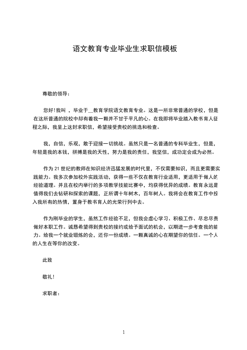 您好!我叫 ,毕业于__教育学院语文教育专业。这是一所非常普通的学校,但是在这所普通的院校中却有着我一颗并不甘于平凡的心。在我即将毕业踏入教书育人征程之际,我呈上这封求职信,希望接受贵校的挑选和检查。