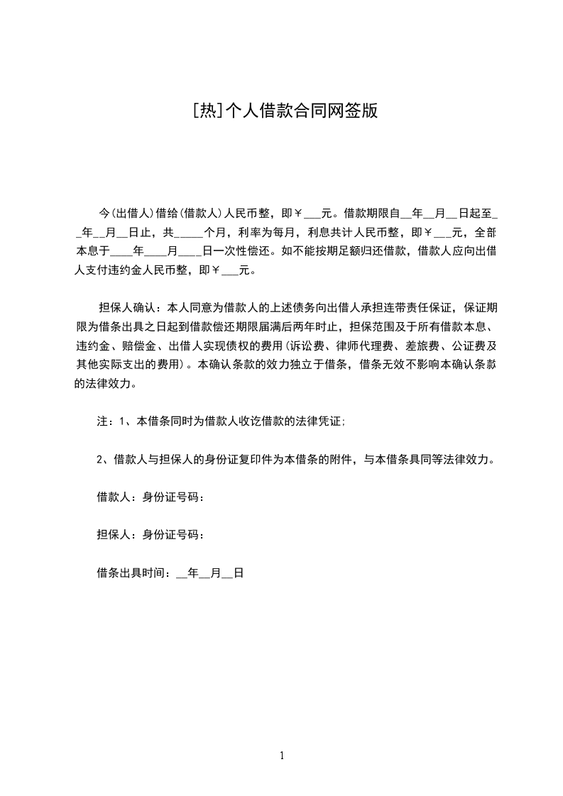 今(出借人)借给(借款人)人民币整,即¥___元。借款期限自__年__月__日起至__年__月__日止,共_____个月,利率为每月,利息共计人民币整,即¥___元,全部本息于____年____月____日一次性偿还。如不能按期足额归还借款,借款人应向出借人支付违约金人民币整,即¥___元。