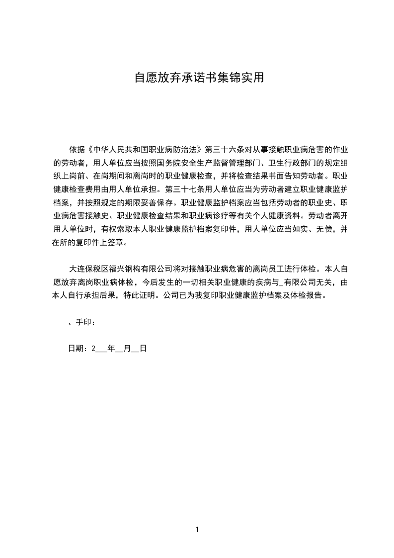 大连保税区福兴钢构有限公司将对接触职业病危害的离岗员工进行体检。本人自愿放弃离岗职业病体检,今后发生的一切相关职业健康的疾病与_有限公司无关,由本人自行承担后果,特此证明。公司已为我复印职业健康监护档案及体检报告。