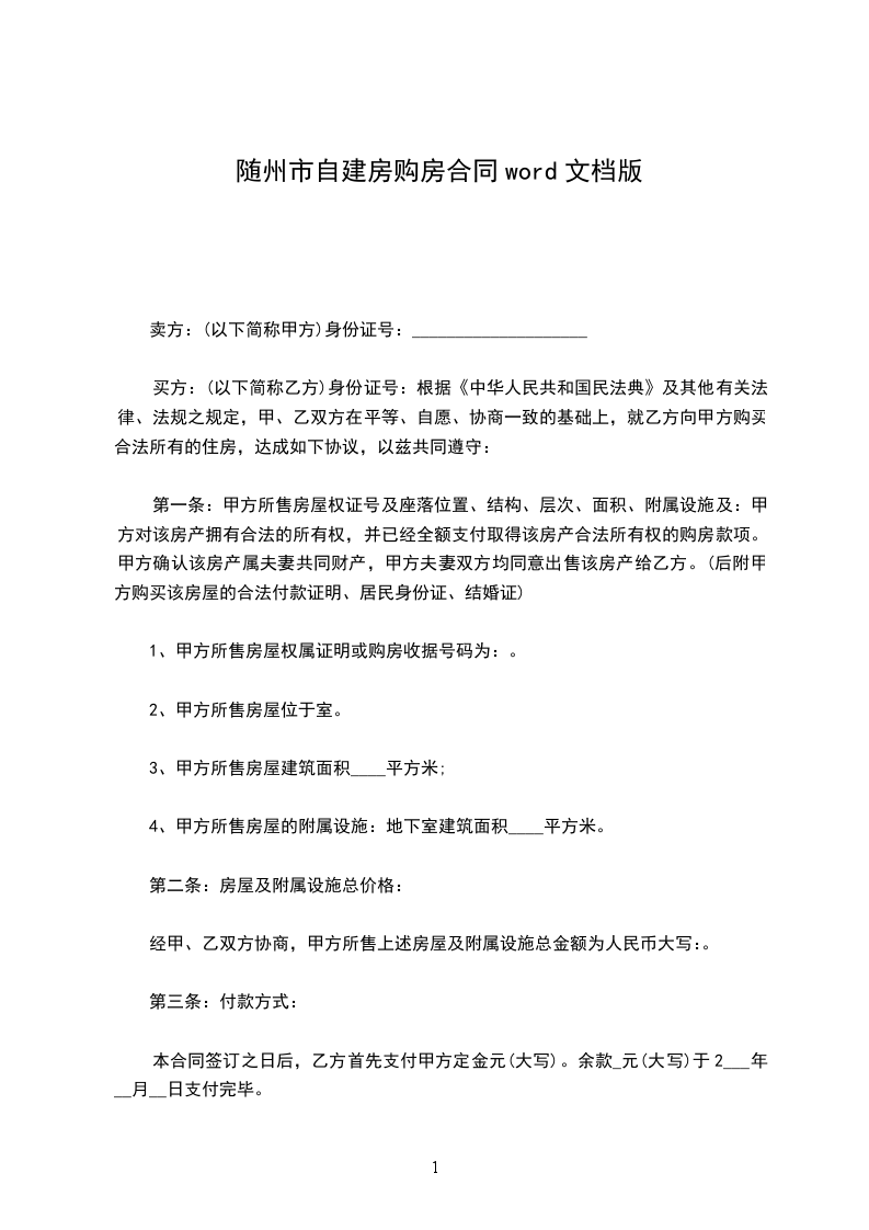 第一条合同标的:乙方同意购买甲方拥有的座落在______省______市______区________________________拥有的房地产(住宅),该房地产建筑面积为______平方米。