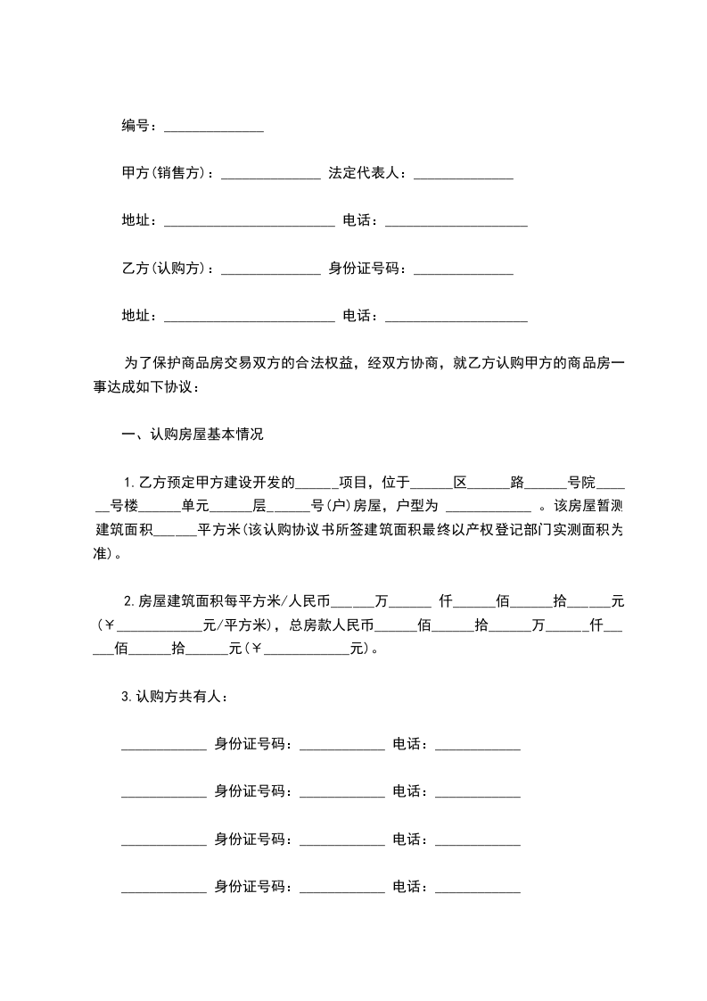 1.乙方预定甲方建设开发的______项目,位于______区______路______号院______号楼______单元______层______号(户)房屋,户型为 ____________ 。该房屋暂测建筑面积______平方米(该认购协议书所签建筑面积最终以产权登记部门实测面积为准)。